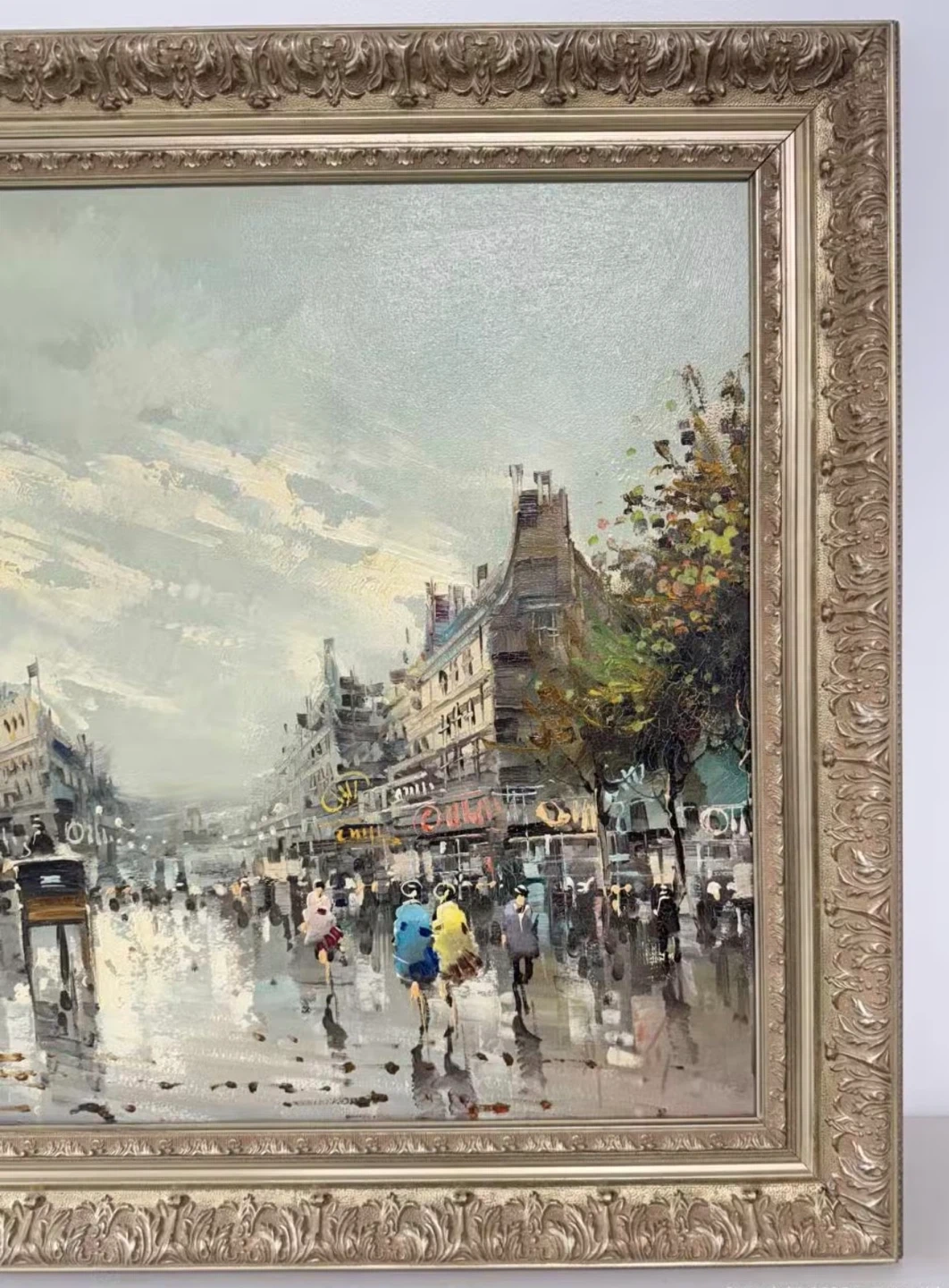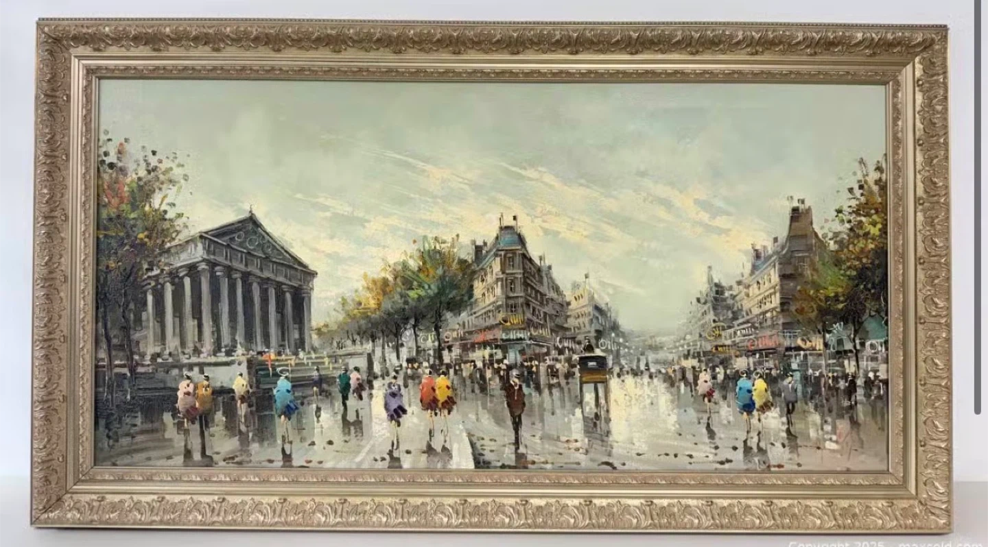 Oil painting depicting a bustling Parisian street scene with people carrying umbrellas. The artwork is housed in an ornate, gold-toned frame. This piece adds a touch of European charm to any space.