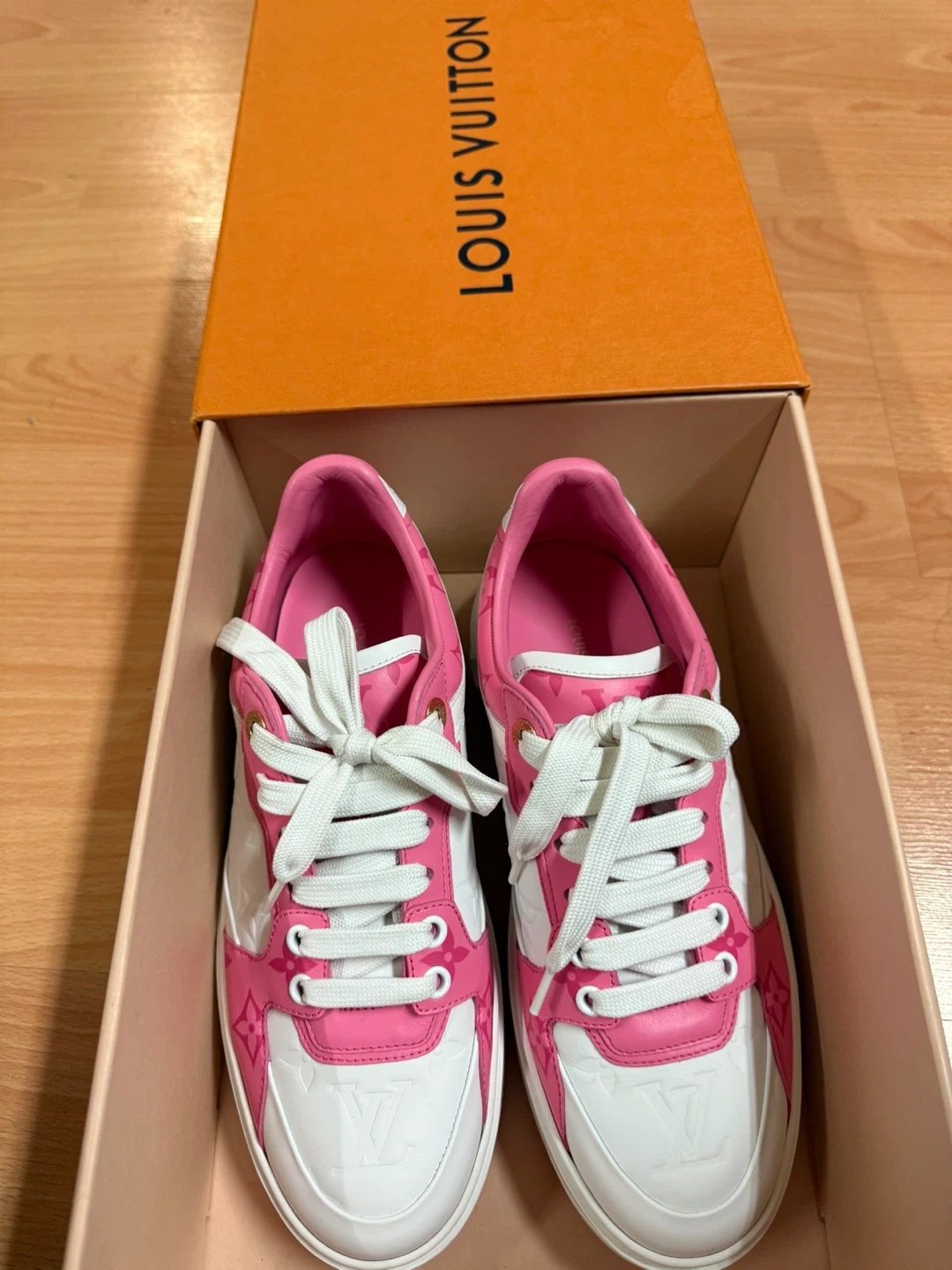 These Louis Vuitton sneakers are white with pink accents and feature the iconic monogram pattern