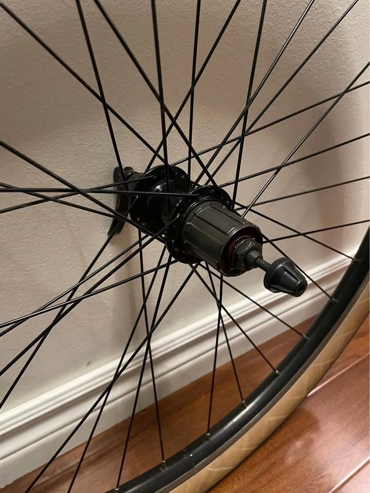 Rear wheel, size 27.5. Features a 135 mm quick release axle and is rim brake only (non-disc). The cassette body can fit up to a 9-speed. Comes with a WTB Horizon 650x47c tire. The axle is straight with no looseness.