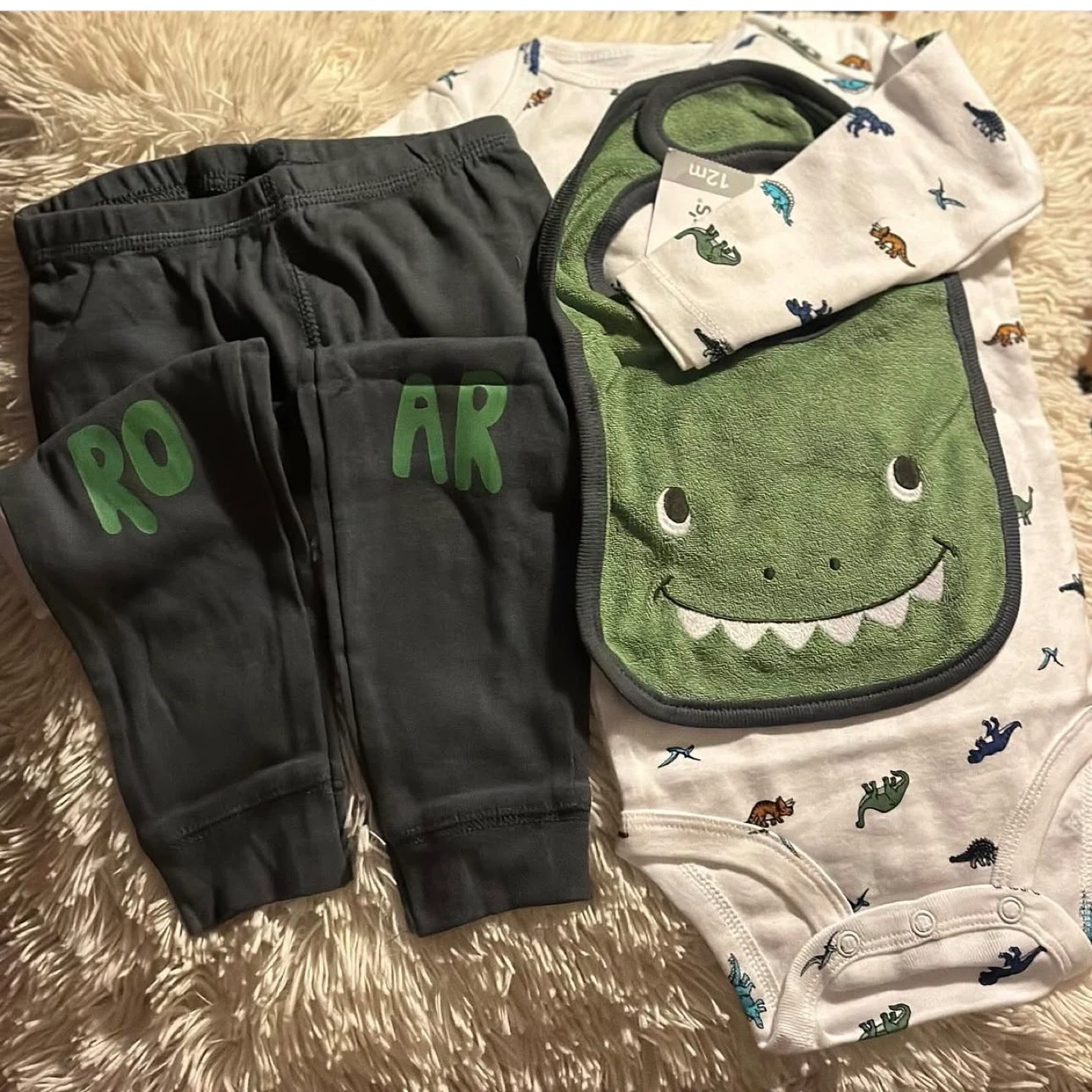 This adorable Carter's 3-piece set for 12-month-olds includes a long-sleeve bodysuit with a dinosaur print, grey pants with 'ROAR' on the legs, and a matching dinosaur bib , are you ready for your little one to explore and play in style.