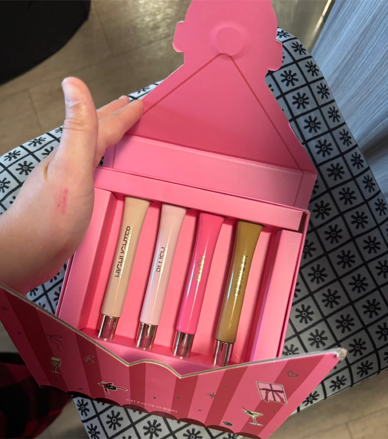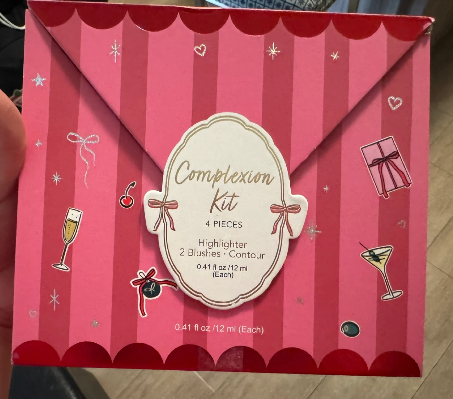 Selling Complexion Kit which includes 4 pieces: highlighter, 2 blushes, and contour. Each tube contains 0.41 fl oz/12 ml. It comes in a cute pink package!
