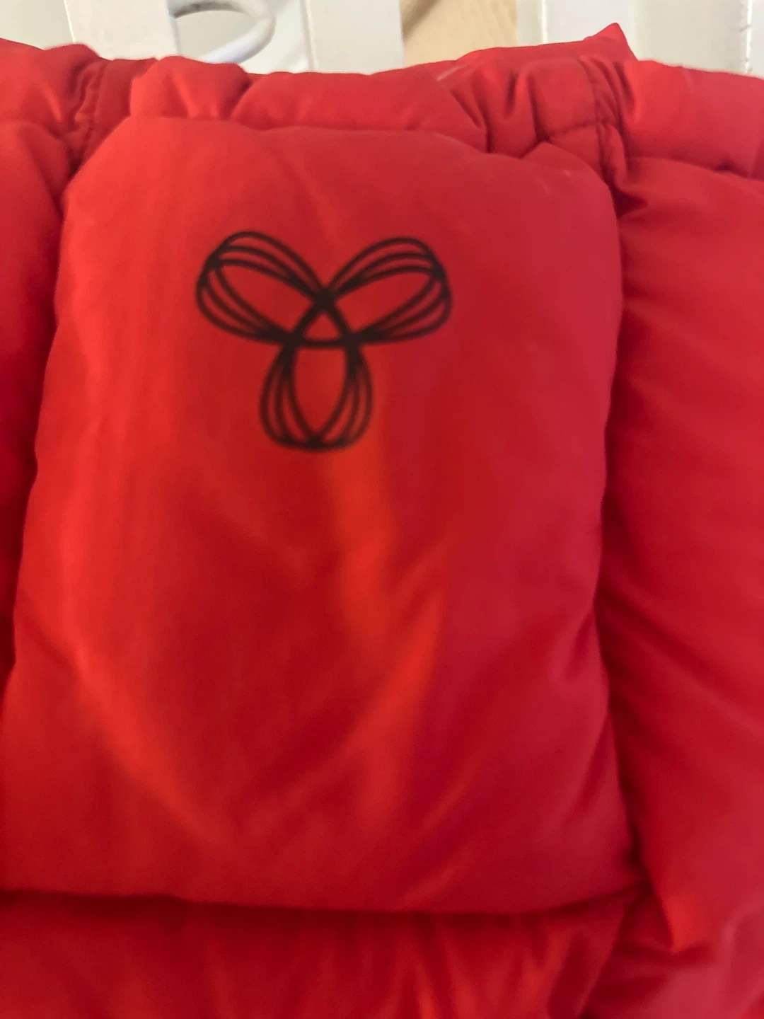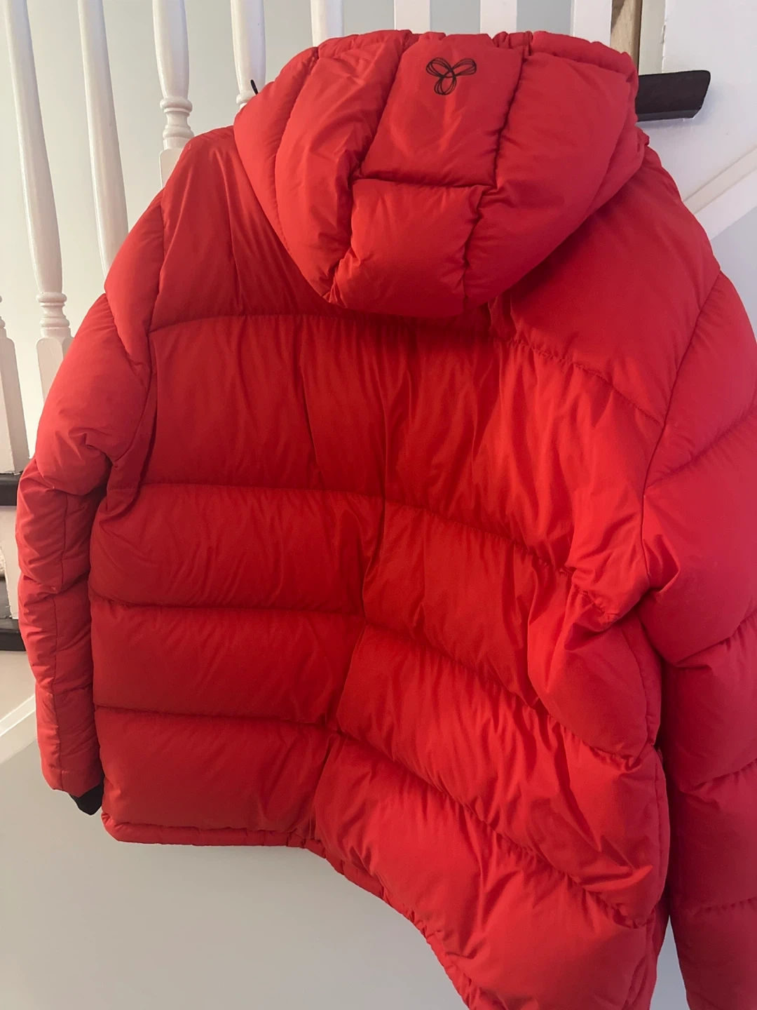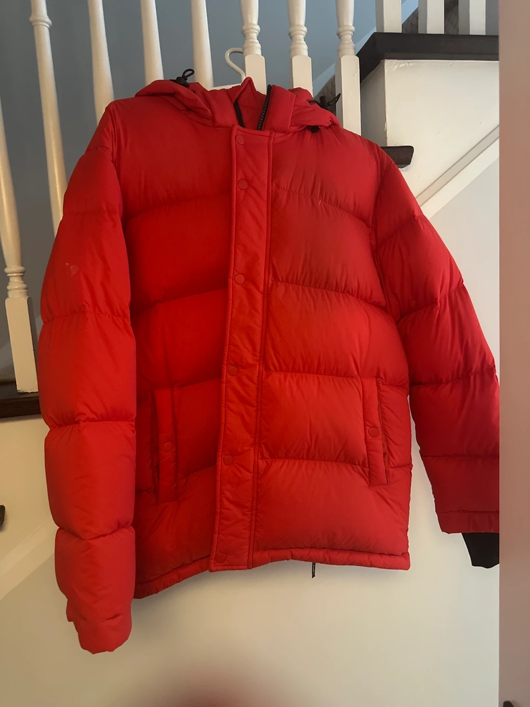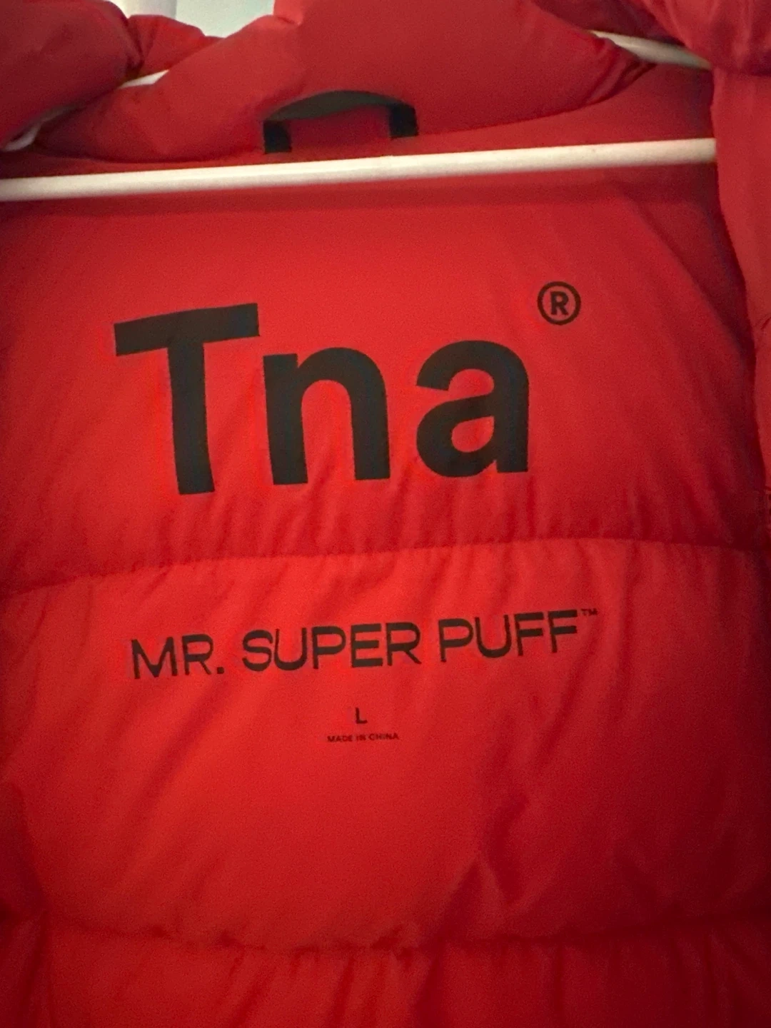 This Tna puffer jacket is a bright red colour. It's a size large and perfect for staying warm in colder weather.