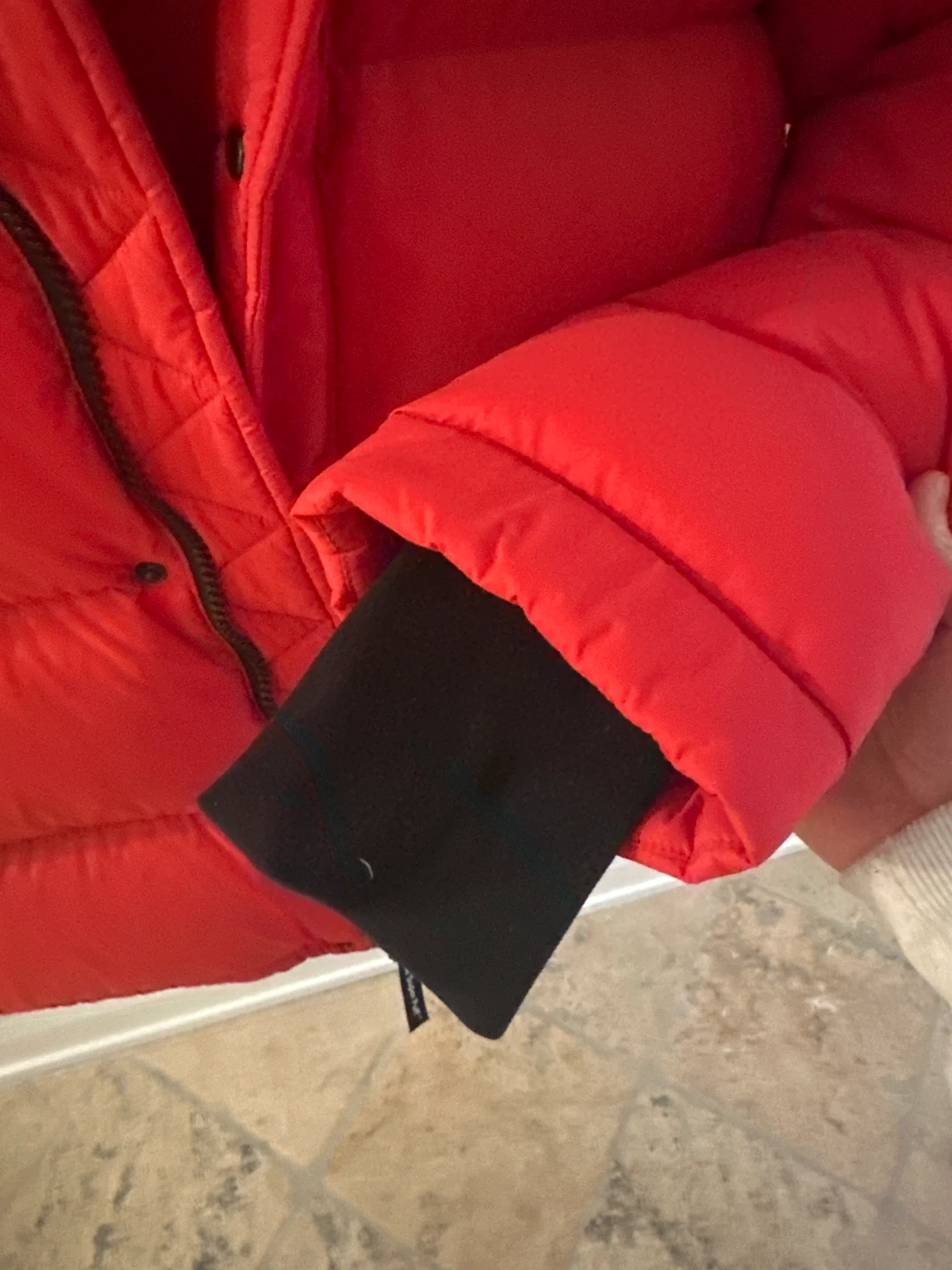 This Tna puffer jacket is a bright red colour. It's a size large and perfect for staying warm in colder weather.