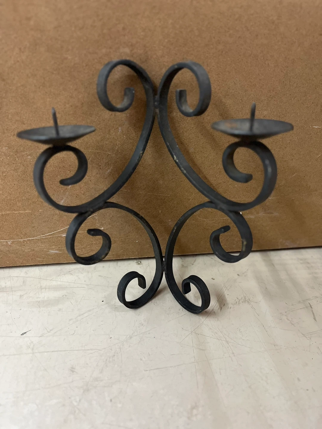 Two decorative black metal wall sconces with scrollwork designs. Each sconce holds two taper candles. These would add a touch of vintage charm to any room or garden!