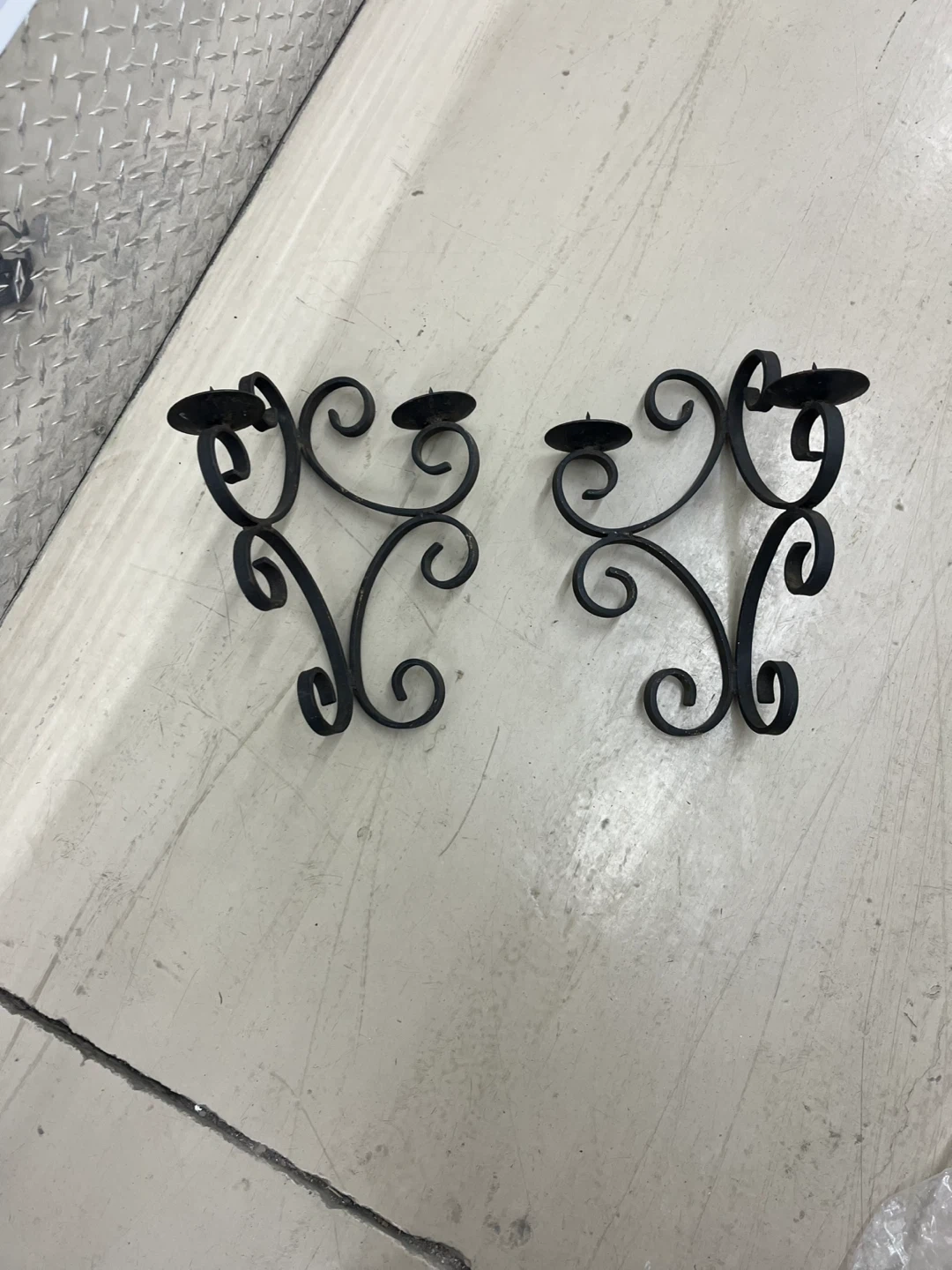 Two decorative black metal wall sconces with scrollwork designs. Each sconce holds two taper candles. These would add a touch of vintage charm to any room or garden!