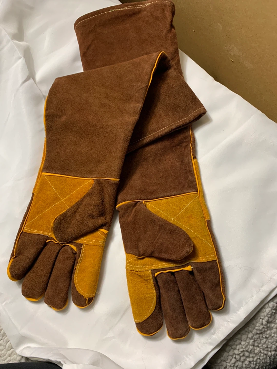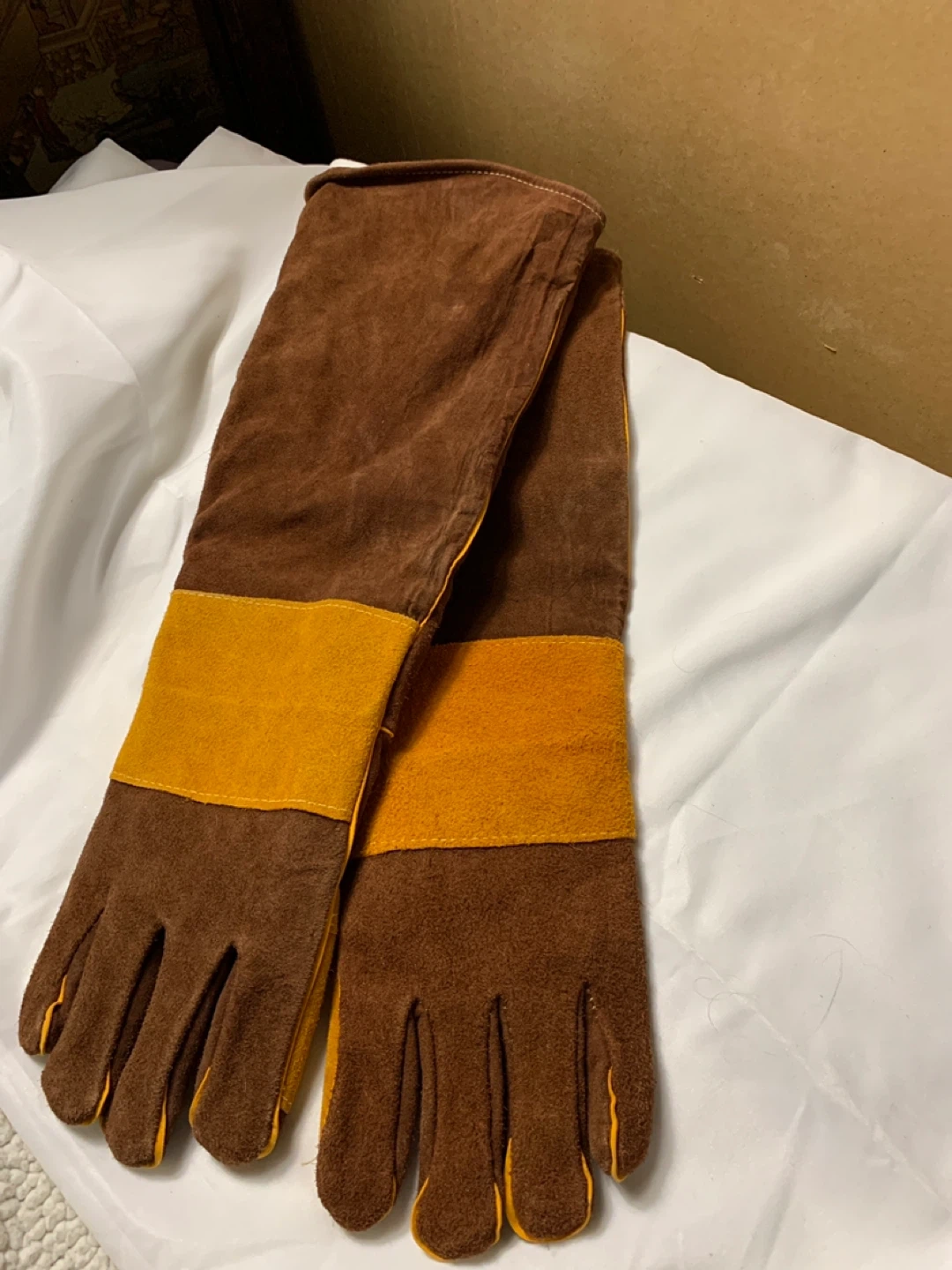 These are a pair of brown and tan suede gloves. They are designed for welding or similar work, offering extended coverage up the arm. The gloves have reinforced stitching for durability.