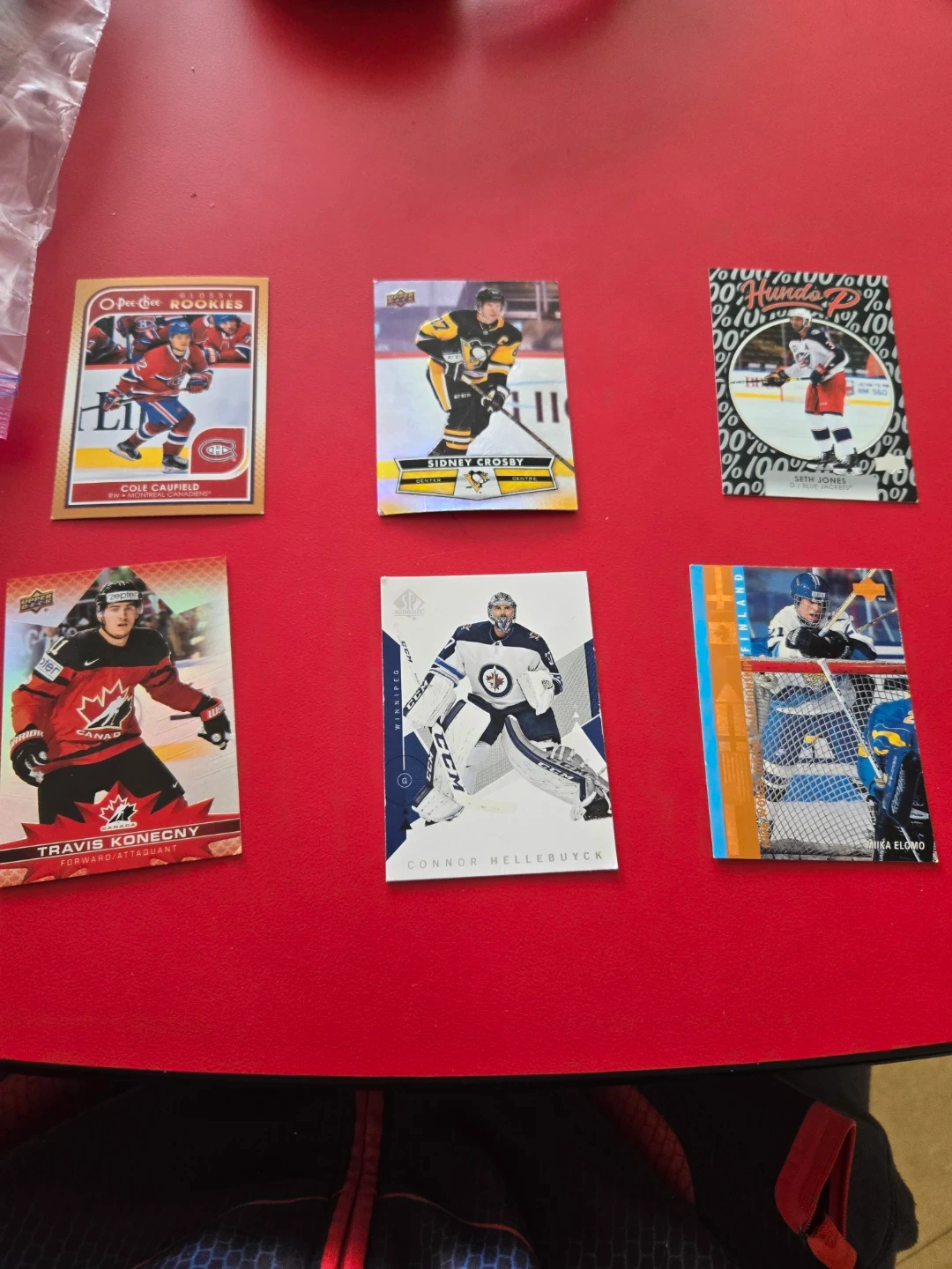 This lot includes six hockey trading cards featuring prominent players. Players included are Cole Caufield, Sidney Crosby, Seth Jones, Travis Konecny, Connor Hellebuyck, and Mika Elomo. They are from various sets, including O-Pee-Chee.
