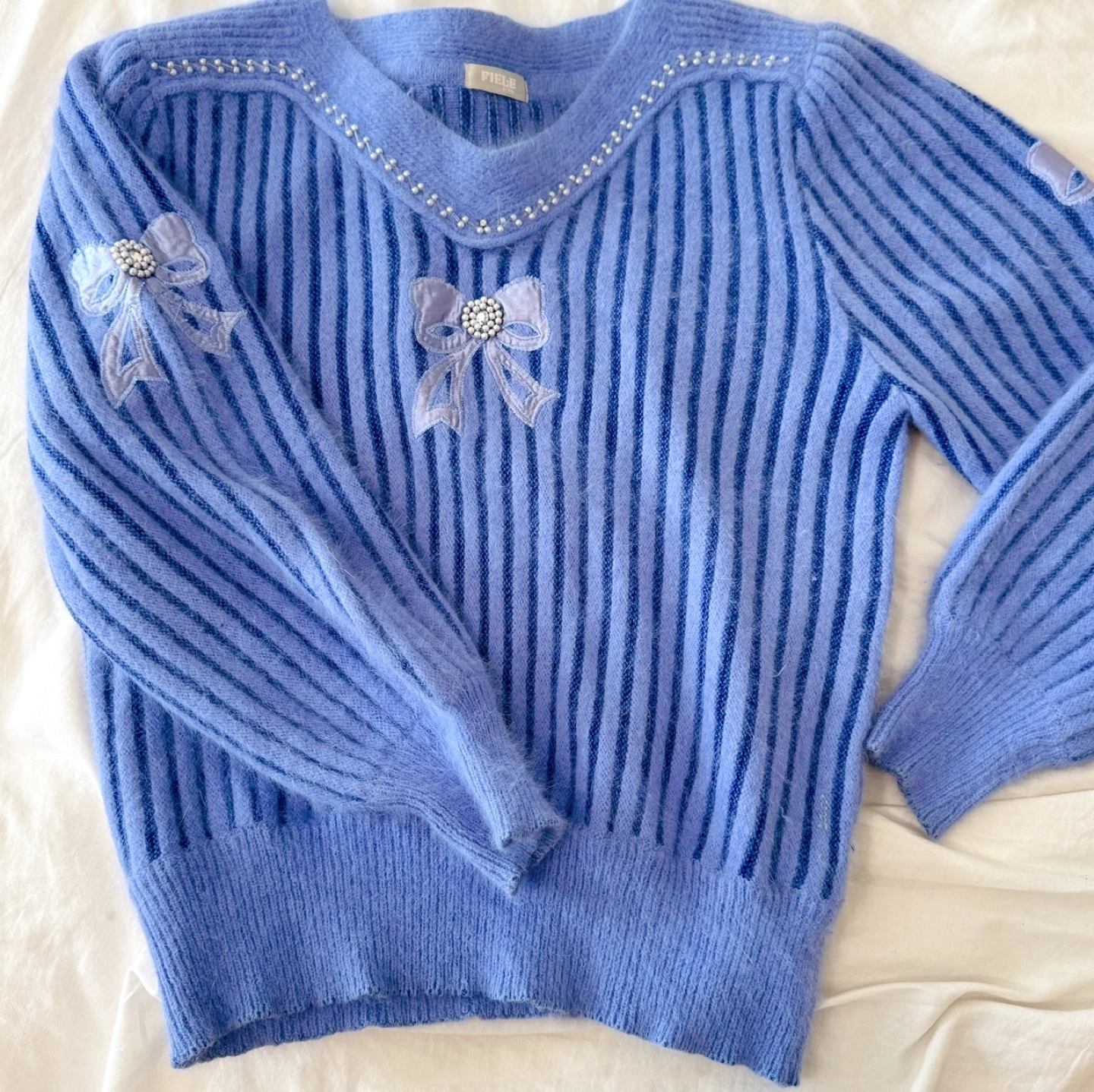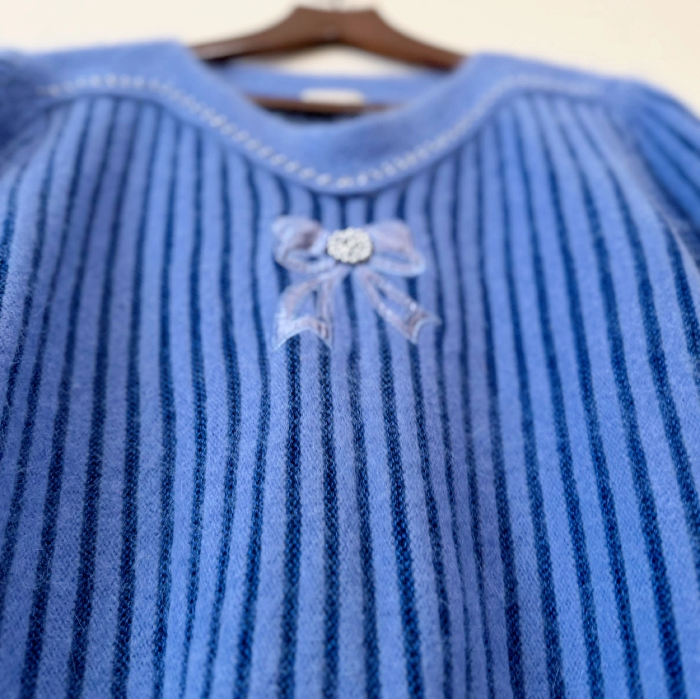 A charming vintage knit sweater featuring soft vertical ribbing and delicate ribbon appliqués with pearl embellishments on the chest and sleeves. The V neckline is adorned with sparkling rhinestones for an added touch of elegance. Cozy yet refined, it’s a perfect statement piece for layering or wearing on its own.