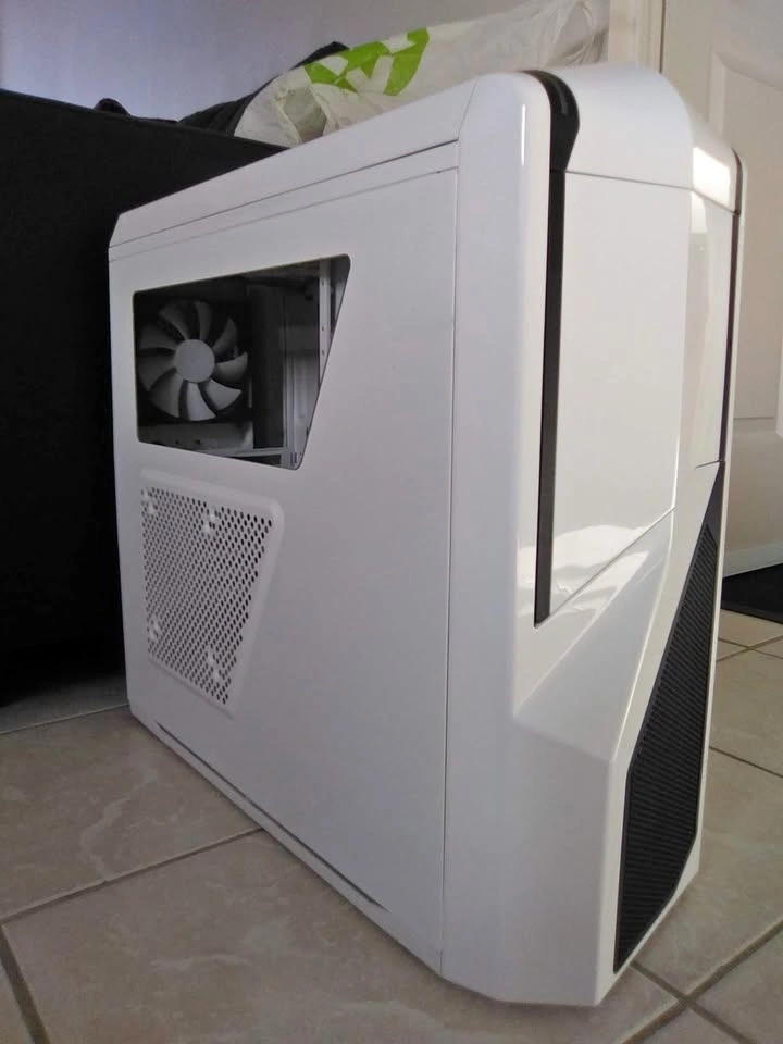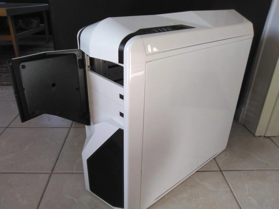 This is a used NZXT Phantom 410 Gaming Desktop PC Case, model number CA-PH410-W1. It is in good condition and all components are very clean. Included are the 3 original fans and one additional fan. The middle set of drive bays can be removed to accommodate exceptionally long graphics cards, and the case's top shroud can discreetly house a radiator for water cooling. Cable management options are excellent, and the PSU mounts at the bottom of the case.