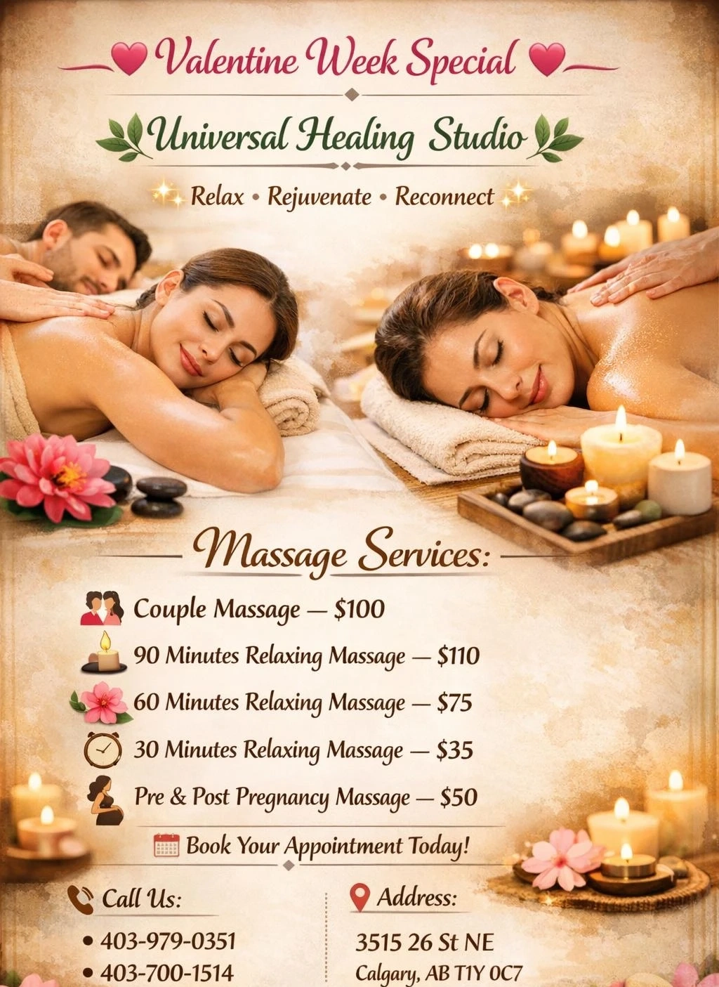 Universal Healing Studio offers a variety of massage services. Choose from couple, relaxing, and pregnancy massages. 30, 60, or 90-minute options are available. Book your appointment today!