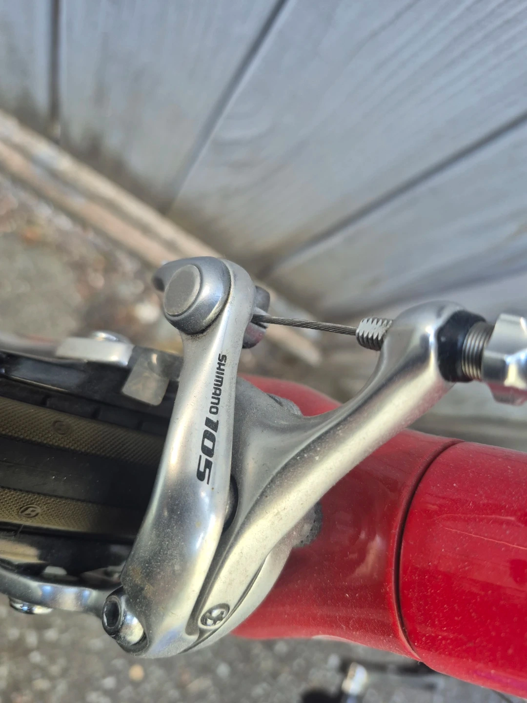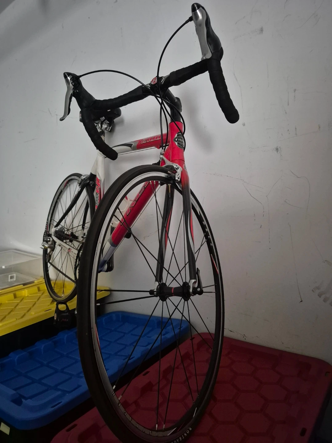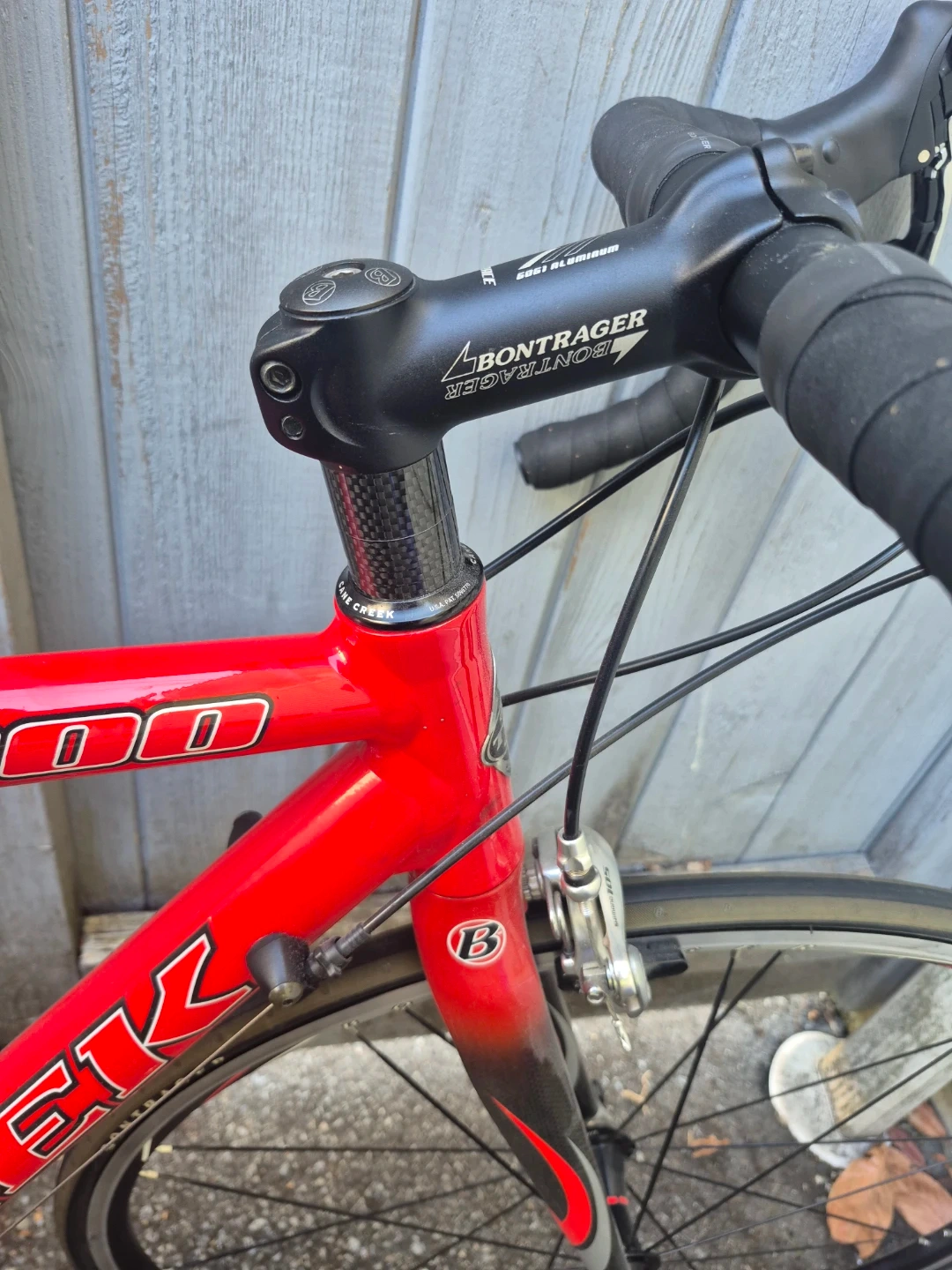 This is a red and white Trek 2000 road bike. It's equipped with drop handlebars and a water bottle cage. This bike's frame is made of aluminum.