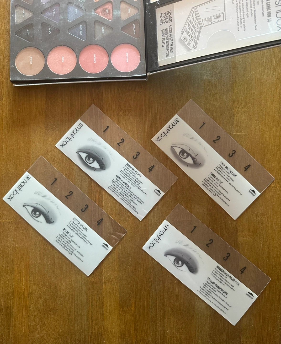 This palette includes a variety of eyeshadows, blushes, and bronzers. It comes with cards to help you create different eye looks.