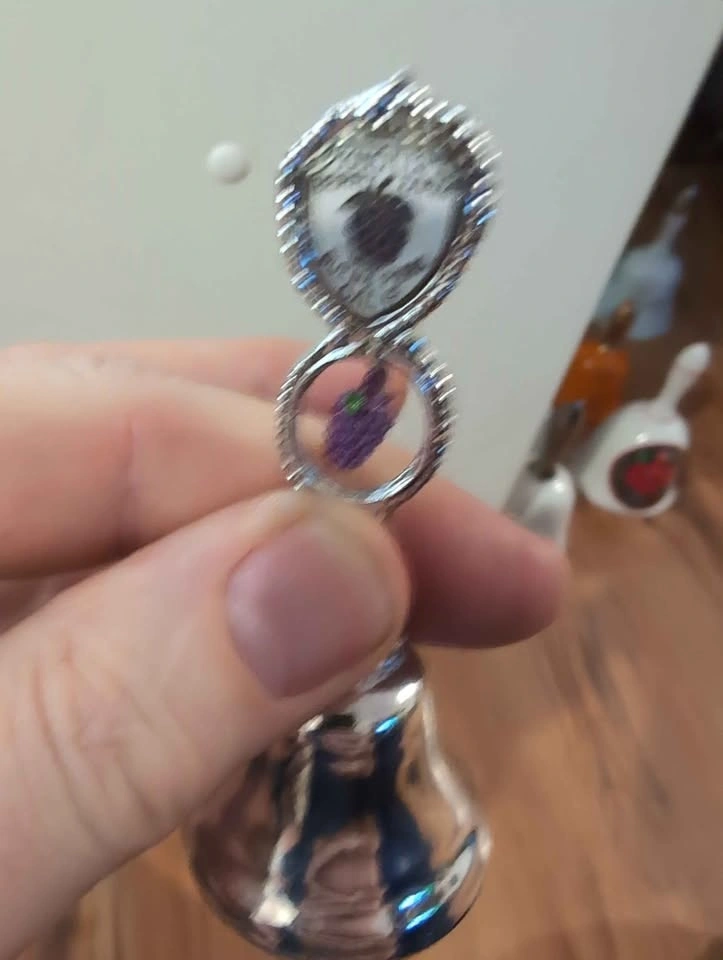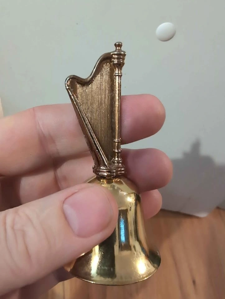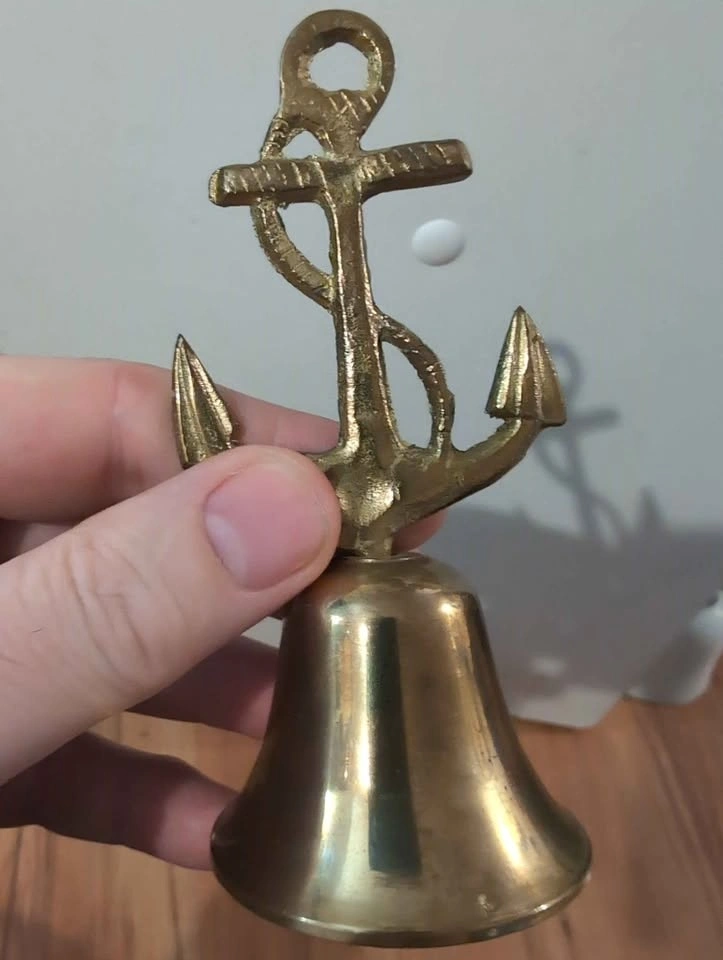Collection of 7 decorative hand bells including nautical, harp, fruit, and souvenir styles. One is a Queen Anne silver-plated bell made in England (Mayell & Co.). Great for collectors, décor, or crafting. $45 for the set. Pickup: Surrey Central, Guildford Mall, or New Westminster Quay.