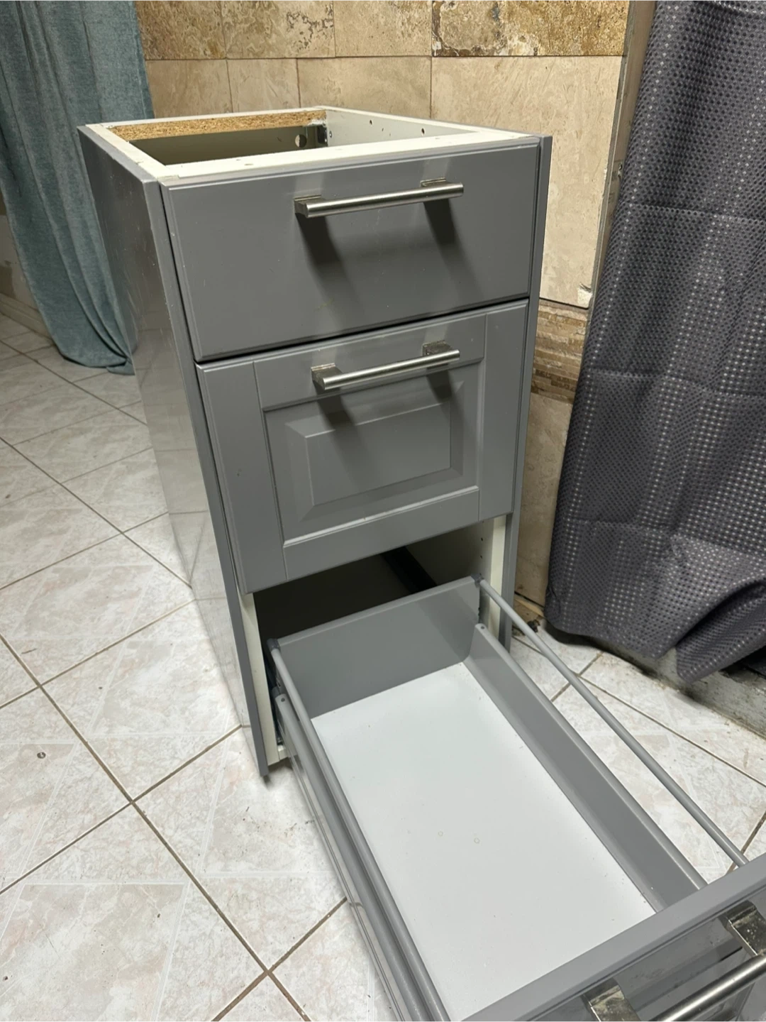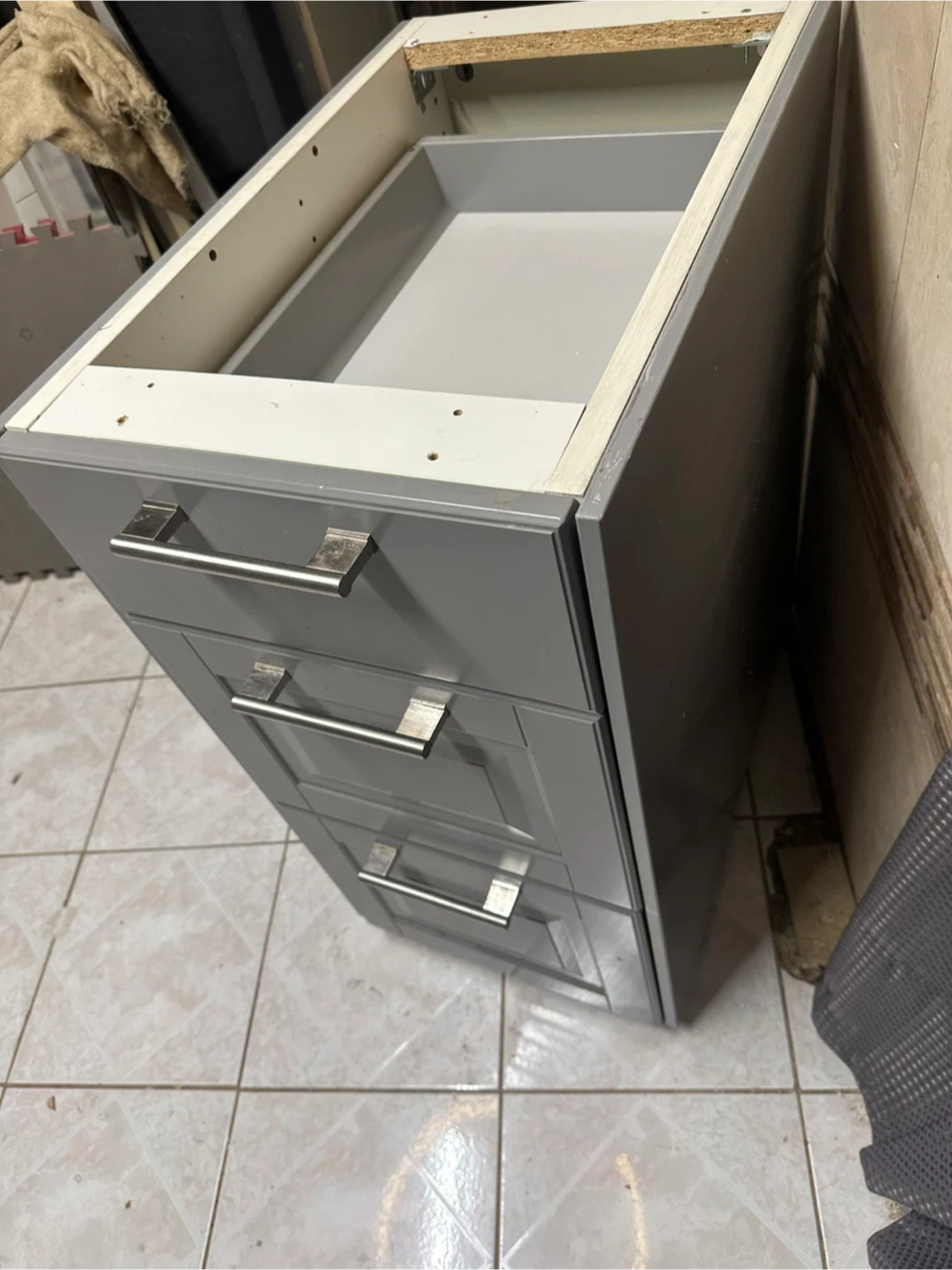 This is a grey cabinet base with three drawers.