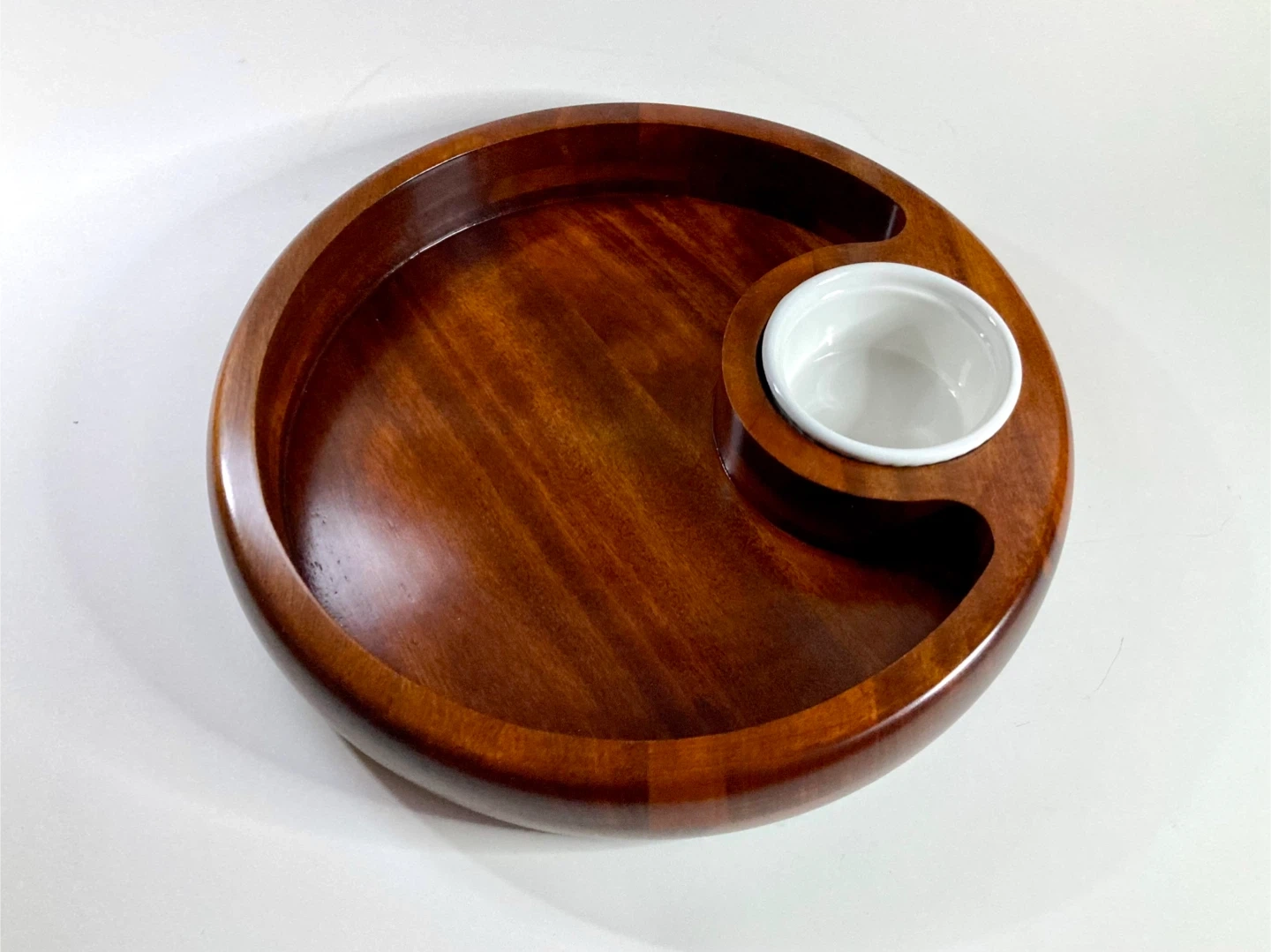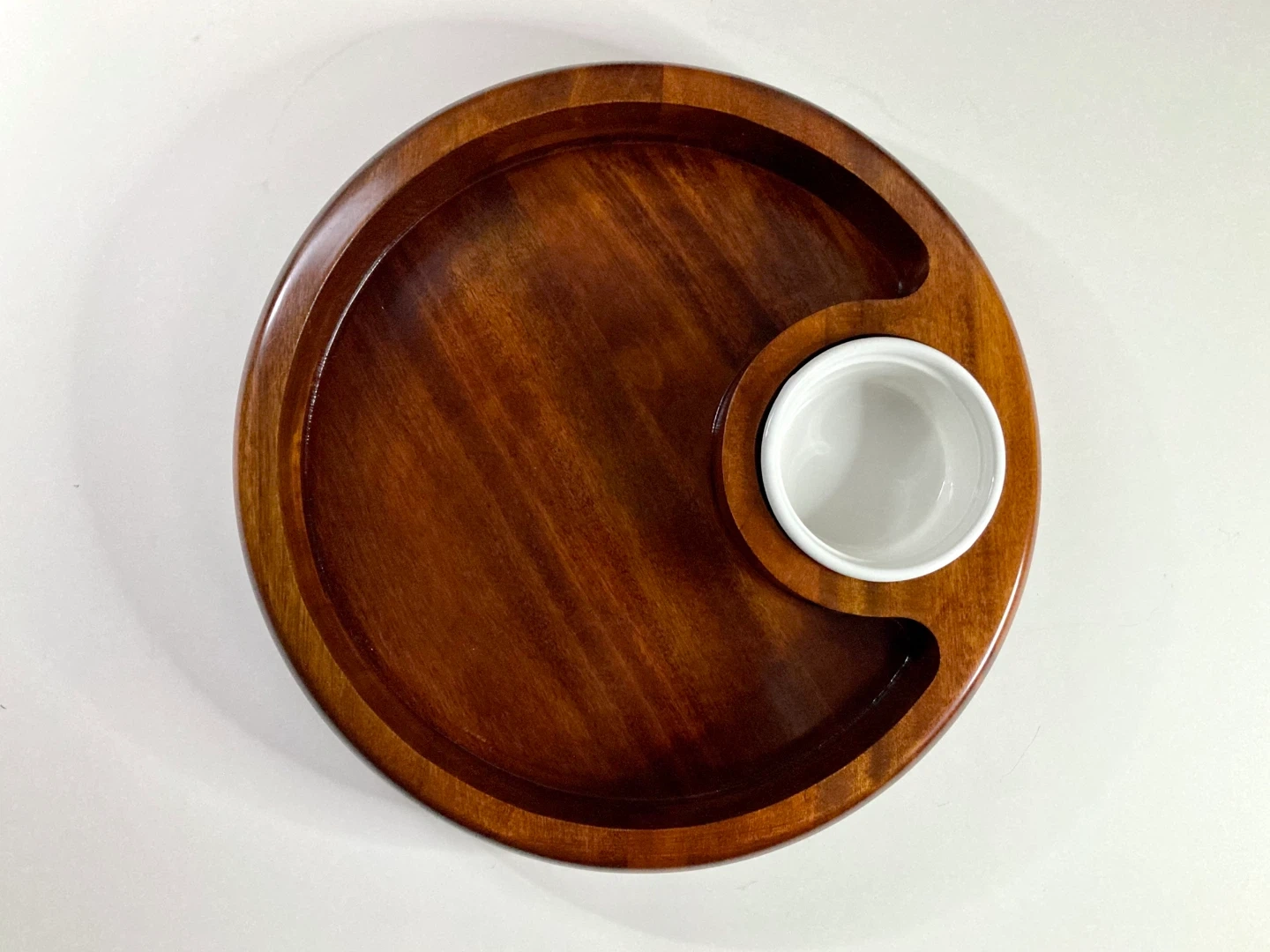 Vintage postmodern round wooden platter with a built-in section for a dipping sauce bowl. In brand new condition and still in box, never used.