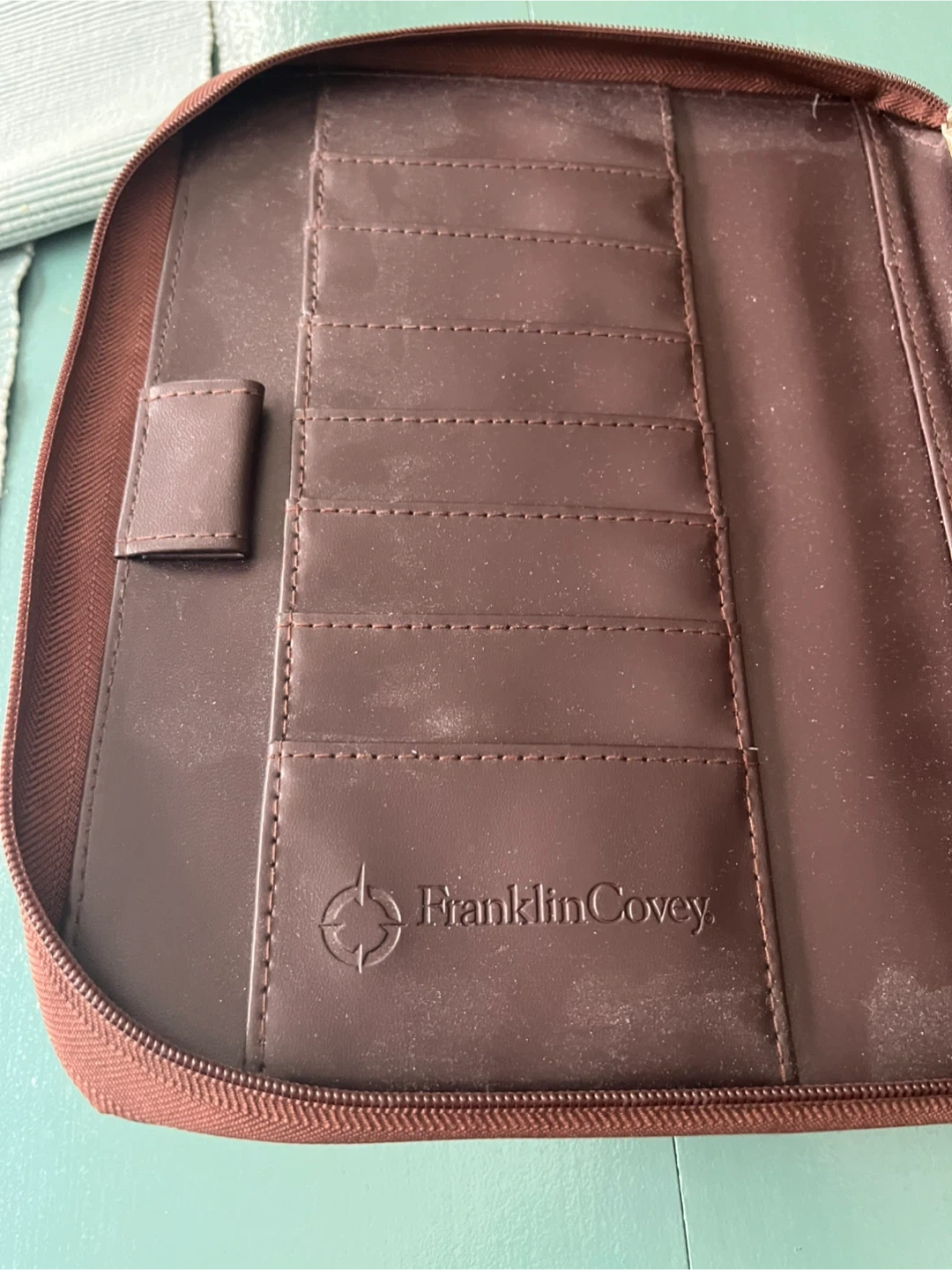 Brown faux leather zippered organizer planner binder with multiple card slots and a 7-ring binder. Made in China.