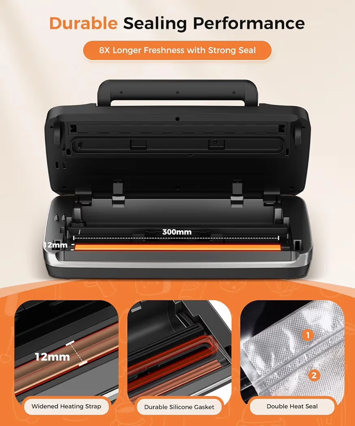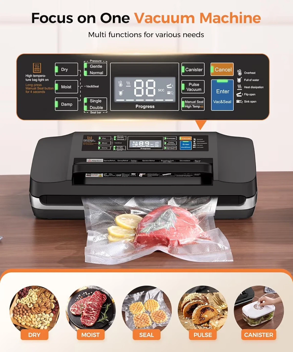 Keep your food fresh longer with this QLQIOB vacuum sealer machine! It features a countdown display, built-in cutter, and built-in bag storage.