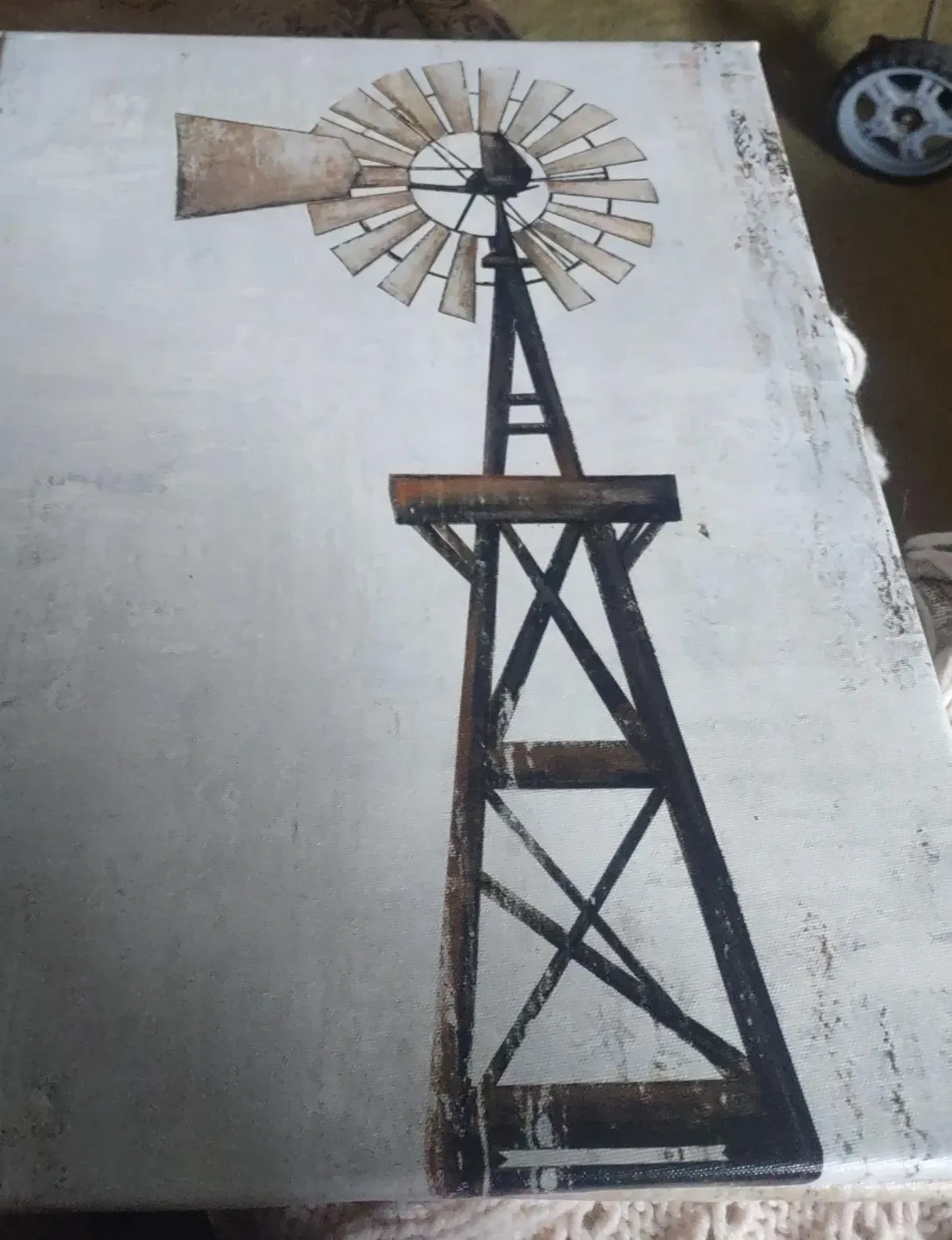This is a canvas wall art print featuring a vintage windmill design. It's a charming piece for adding a rustic touch to your home décor.