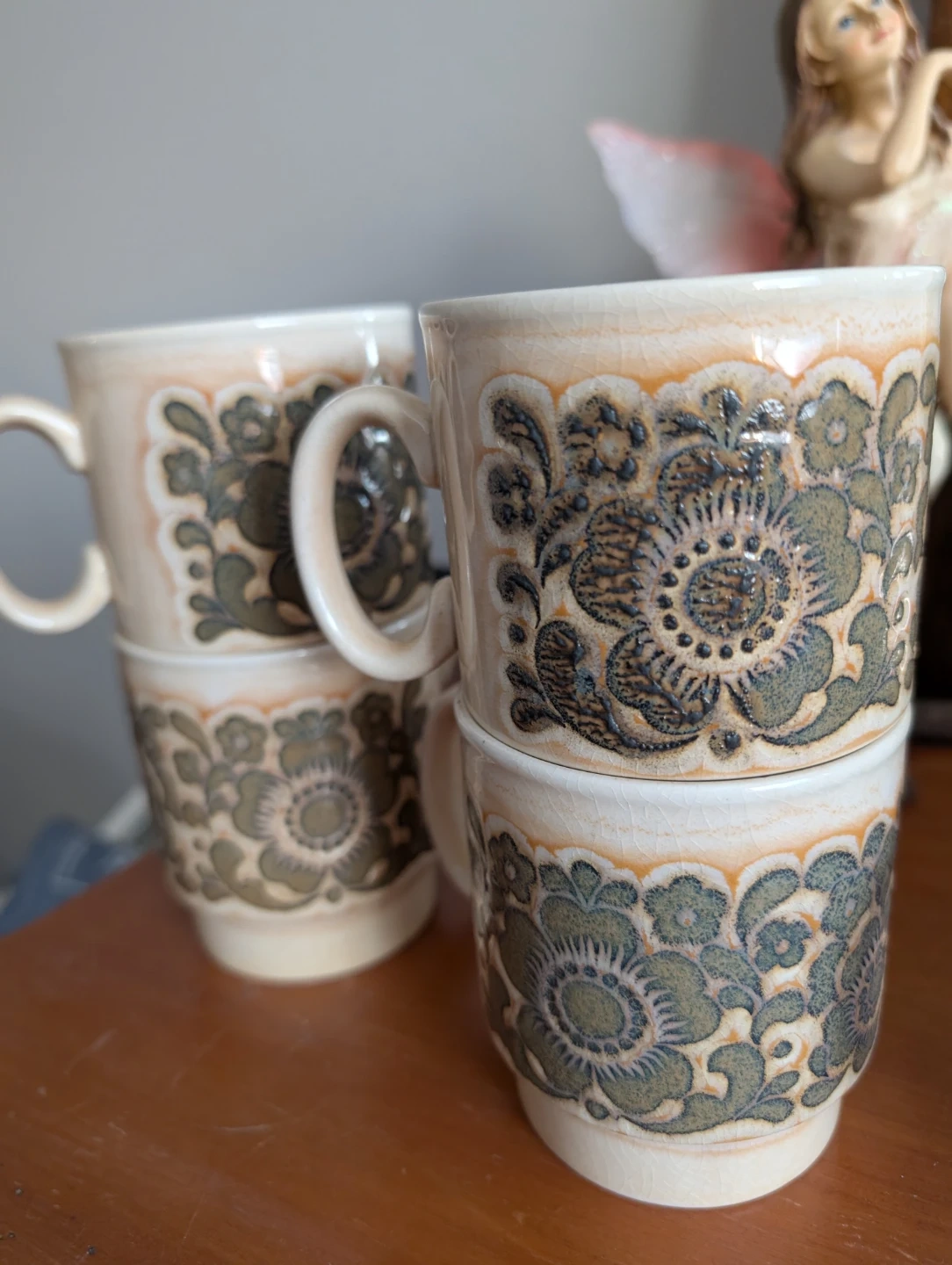 Selling a set of 6 vintage Mid Winter Pottery mugs, marked "Made in England" on the bottom. They feature a unique floral design in earthy tones. Perfect for adding a touch of retro charm to your kitchen!