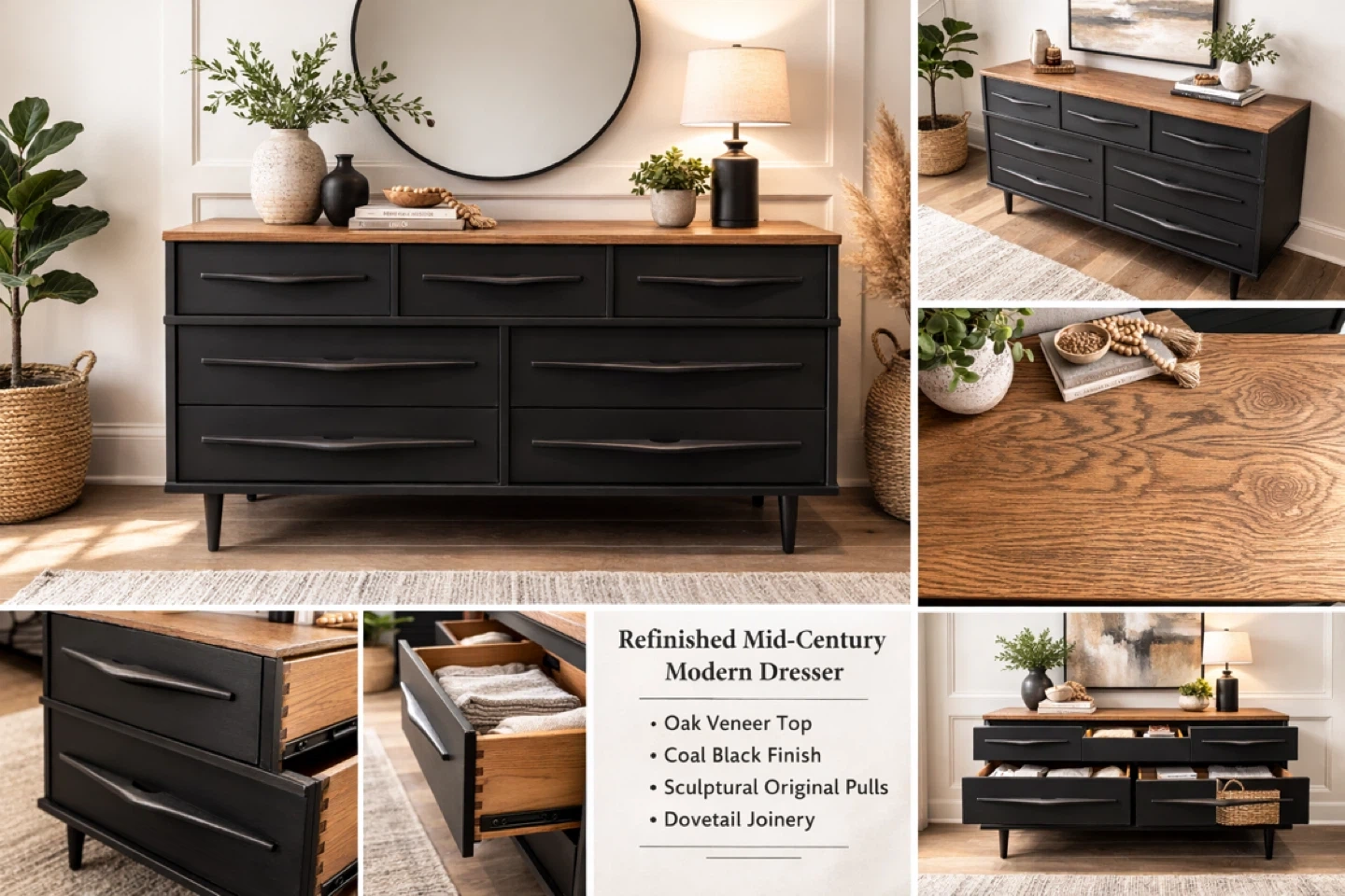 Beautifully restored mid-century modern dresser by Ideal Furniture, thoughtfully refinished to blend classic craftsmanship with a refined, modern aesthetic.