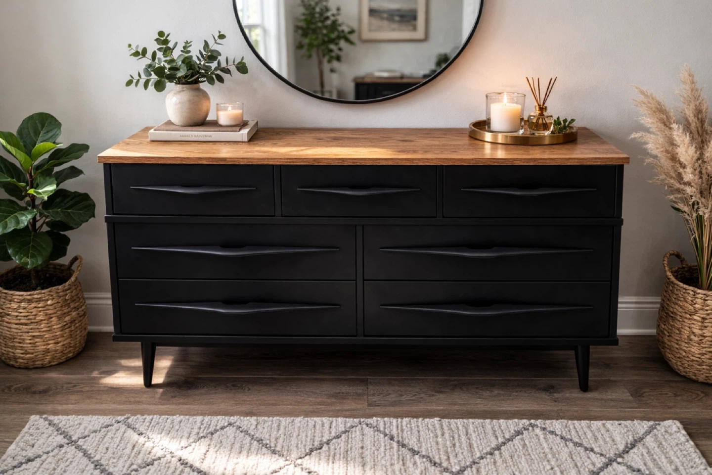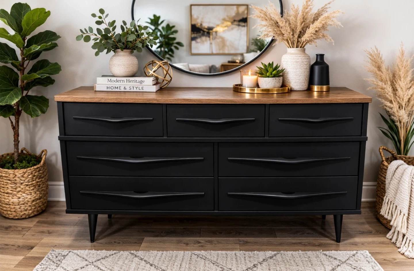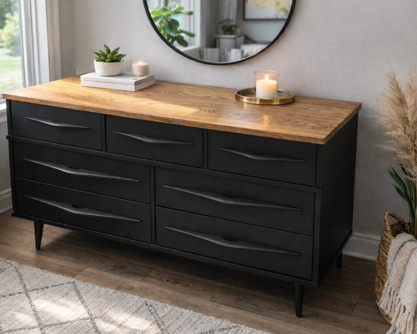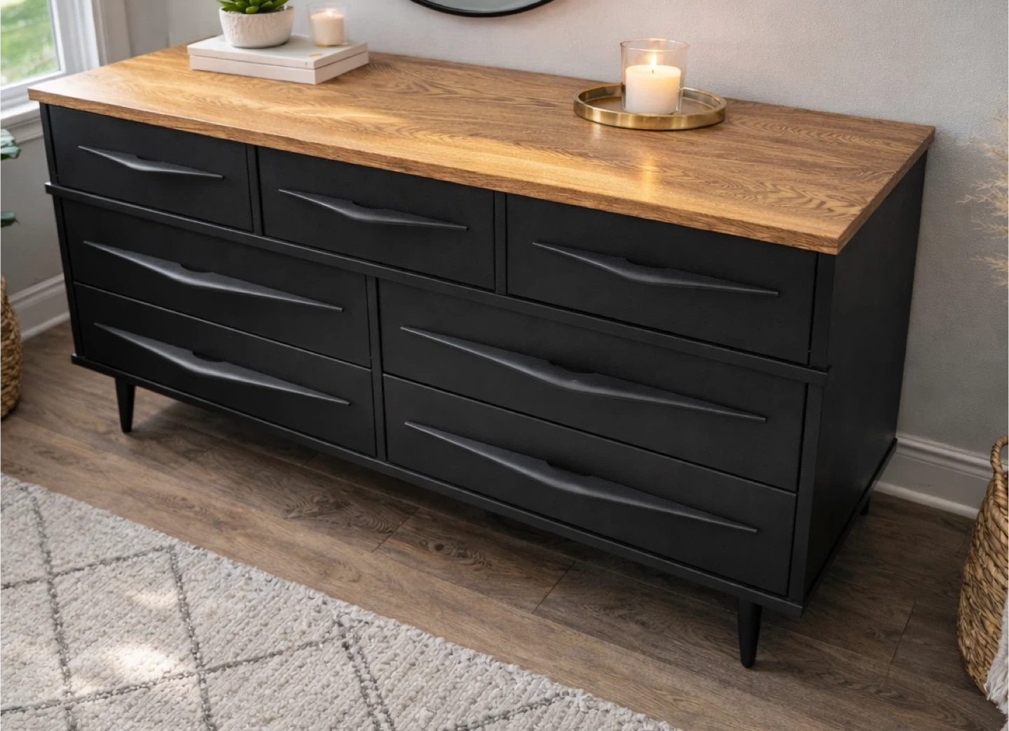 Beautifully restored mid-century modern dresser by Ideal Furniture, thoughtfully refinished to blend classic craftsmanship with a refined, modern aesthetic.