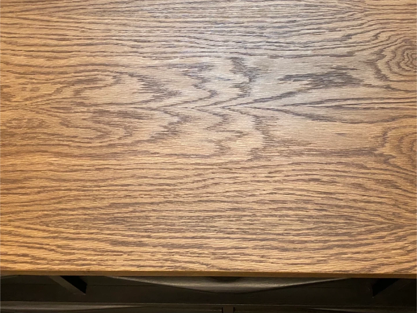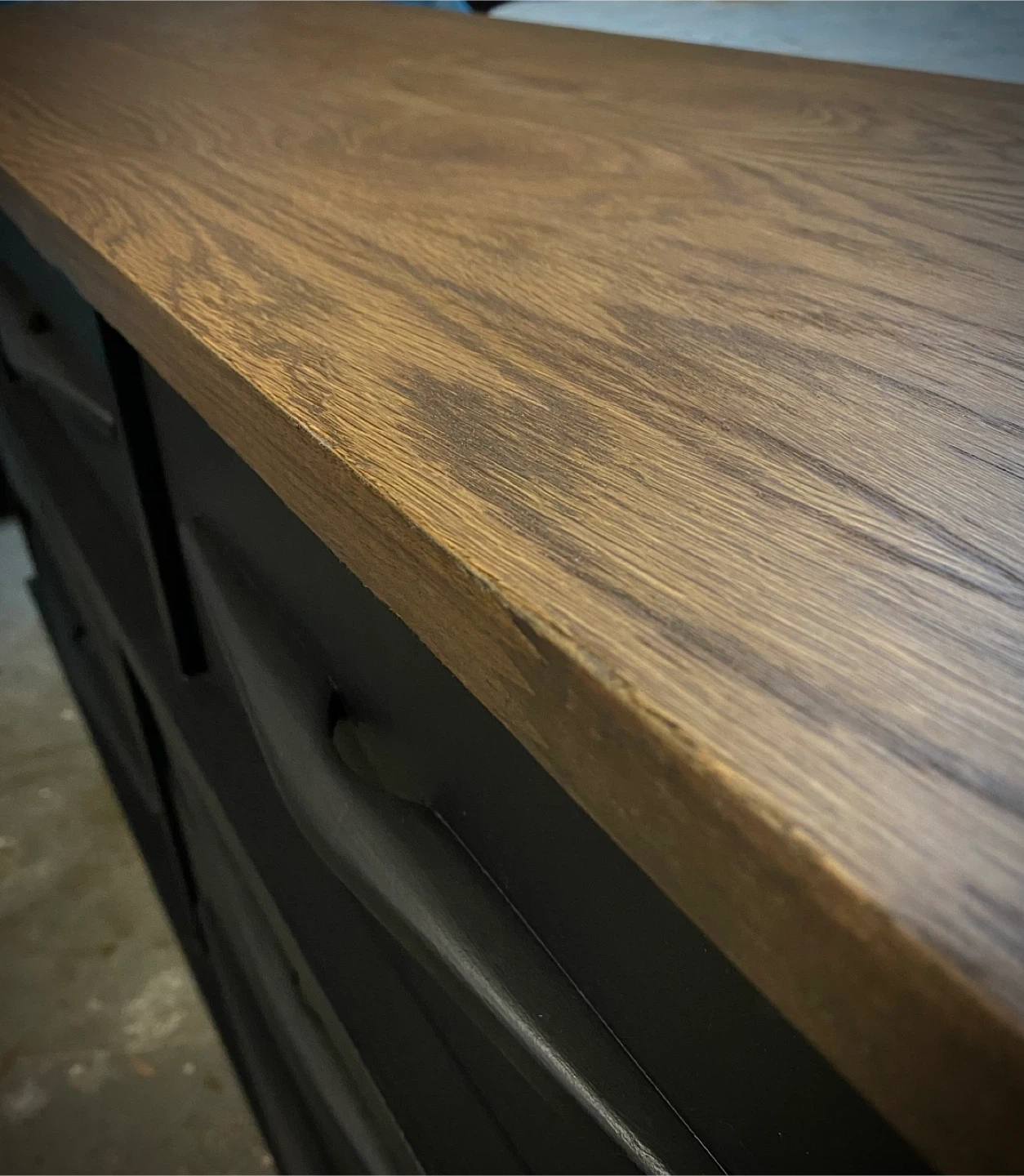 • Oak veneer top professionally applied and finished with a custom Fusion SFO Cappuccino stain wash, creating a soft neutral walnut tone