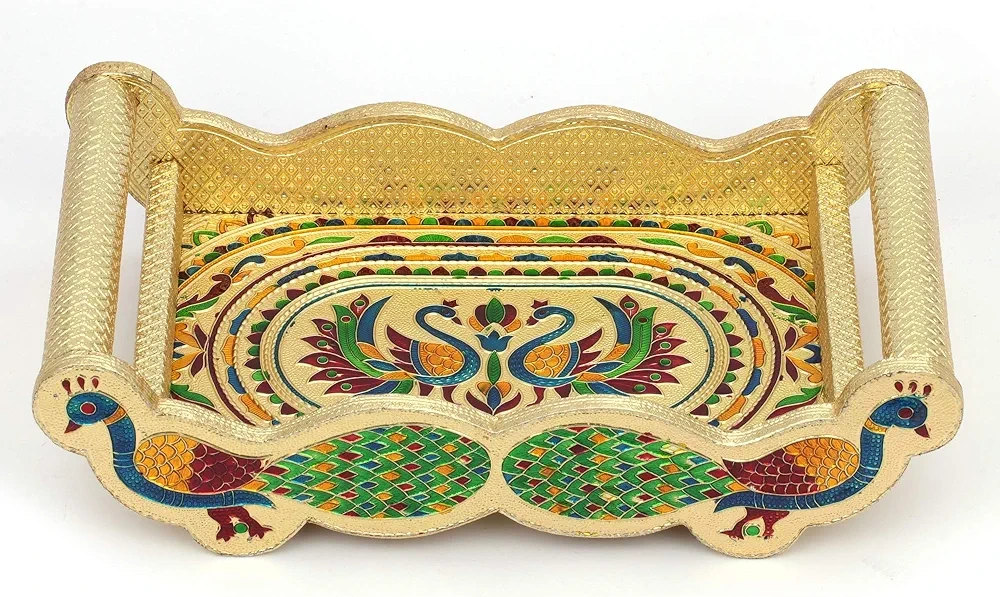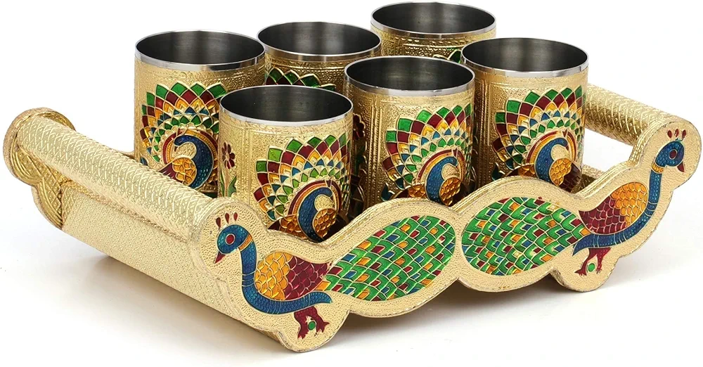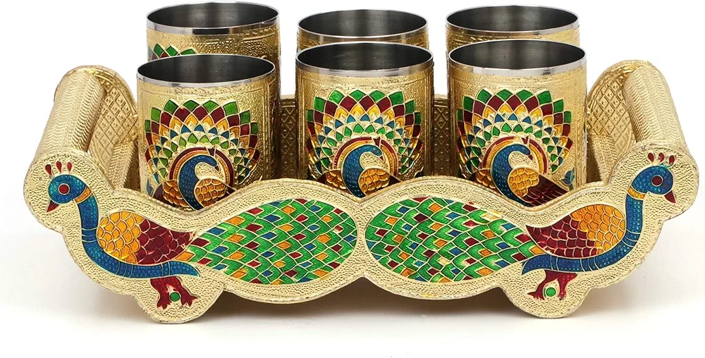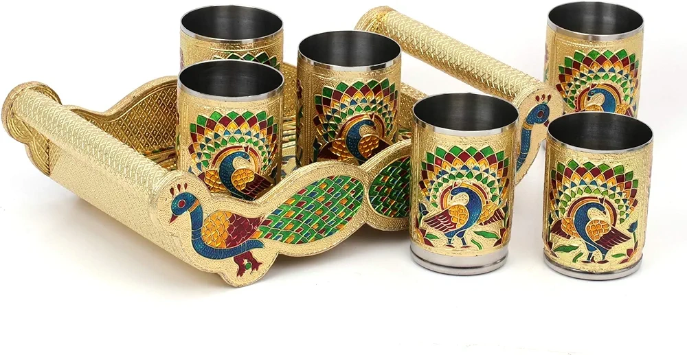 Six stainless steel tumblers. Gold tray with peacock design. Hand-painted details. Unique serving tray set. Suitable for all occasions, it has a great antique look. Never used.