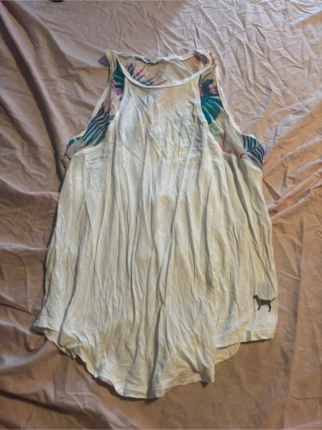 Selling a PINK Super Soft tank top in size M. It's white with a colourful floral pattern around the neckline and armholes. The fabric is lightweight and comfy!
