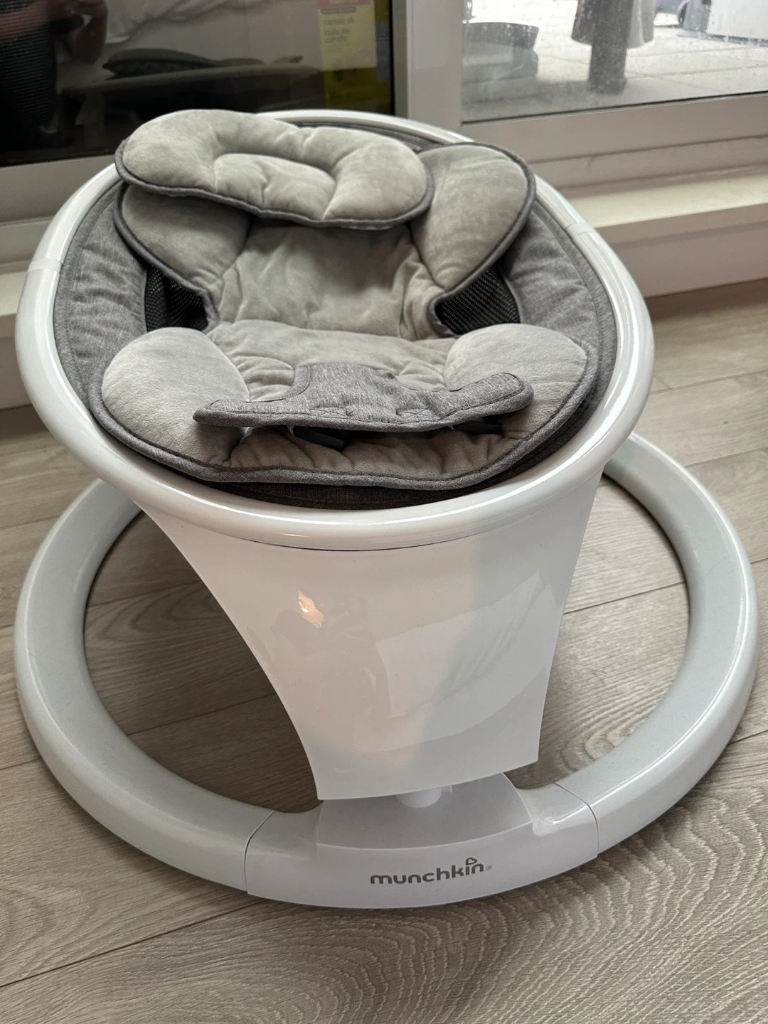This is a Munchkin Swing/Balançoire, model MKCA0788. It's made with 100% polyester material. The body pad and headrest are machine washable. Wipe clean with a damp cloth; do not bleach. Comes with remote. Like brand new, only used 3 times. Original price $300, bought September 2025.