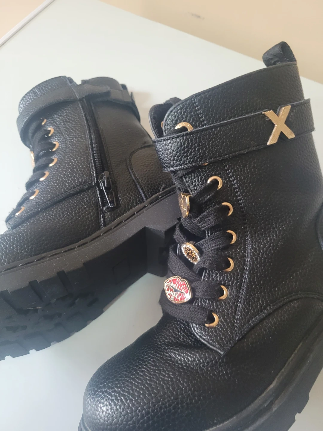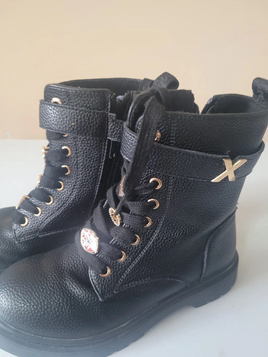 Black combat boots featuring a textured faux leather material and decorative gold charms on the laces. They have a side zipper and buckle closure. Size 13.