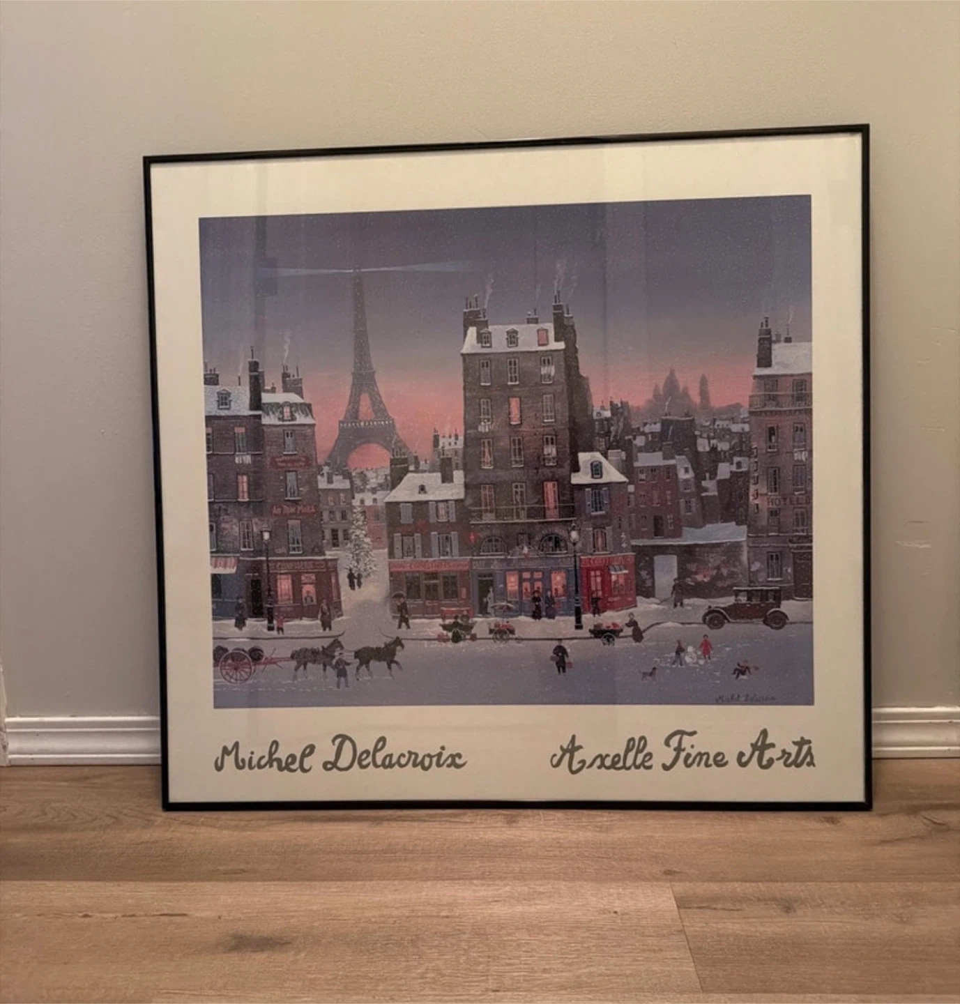 Framed art print by Michel Delacroix featuring a charming winter scene in Paris with the Eiffel Tower visible. The print is presented by Axelle Fine Arts and is ready to hang. It's a lovely piece for any art enthusiast. 26”x28”