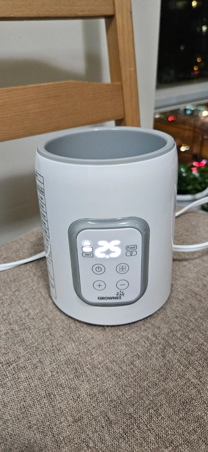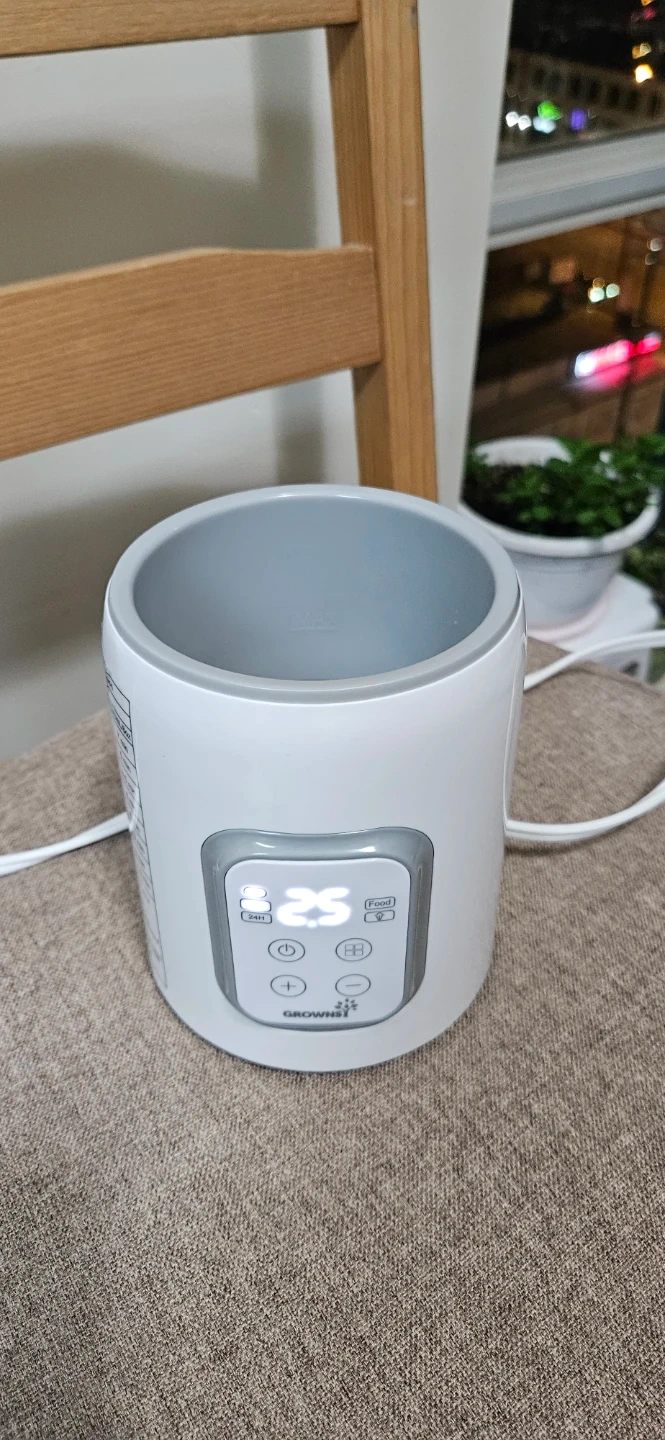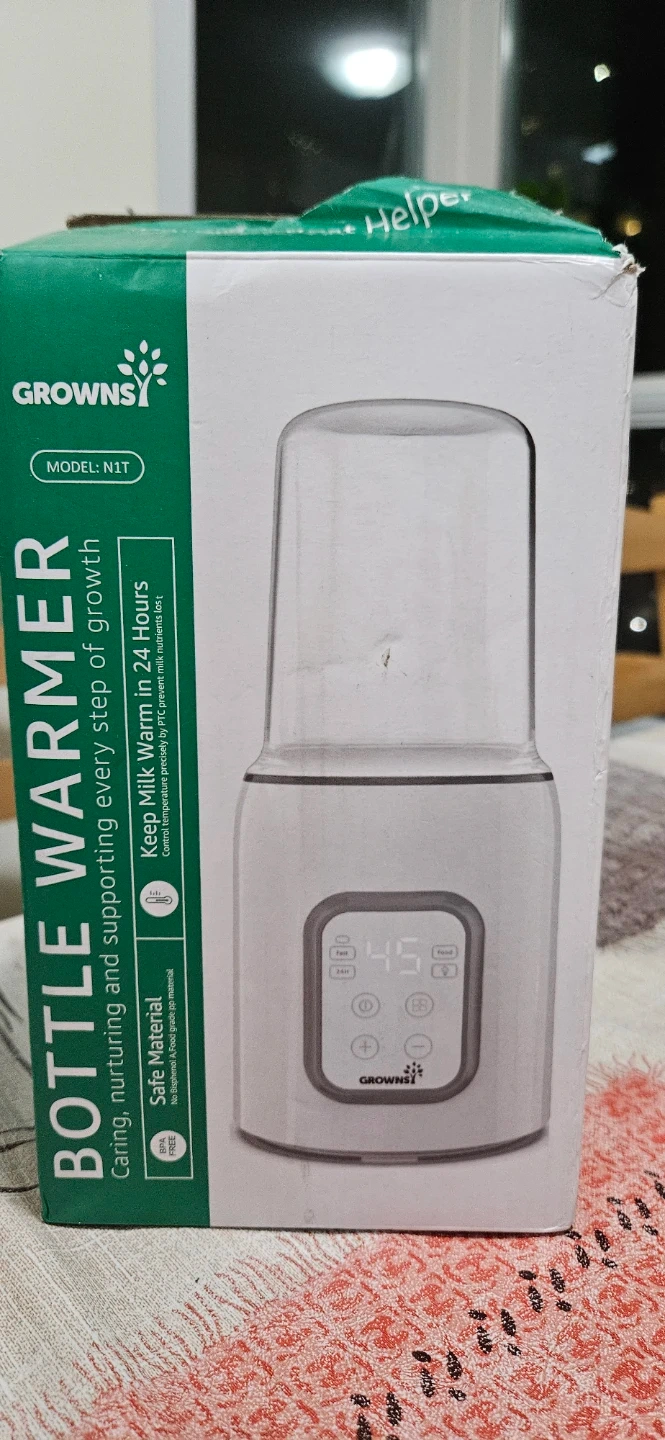 This Grownsy bottle warmer is designed to keep milk warm in 24 hours. It's BPA-free and made with safe material. This device helps warm bottles for feeding.