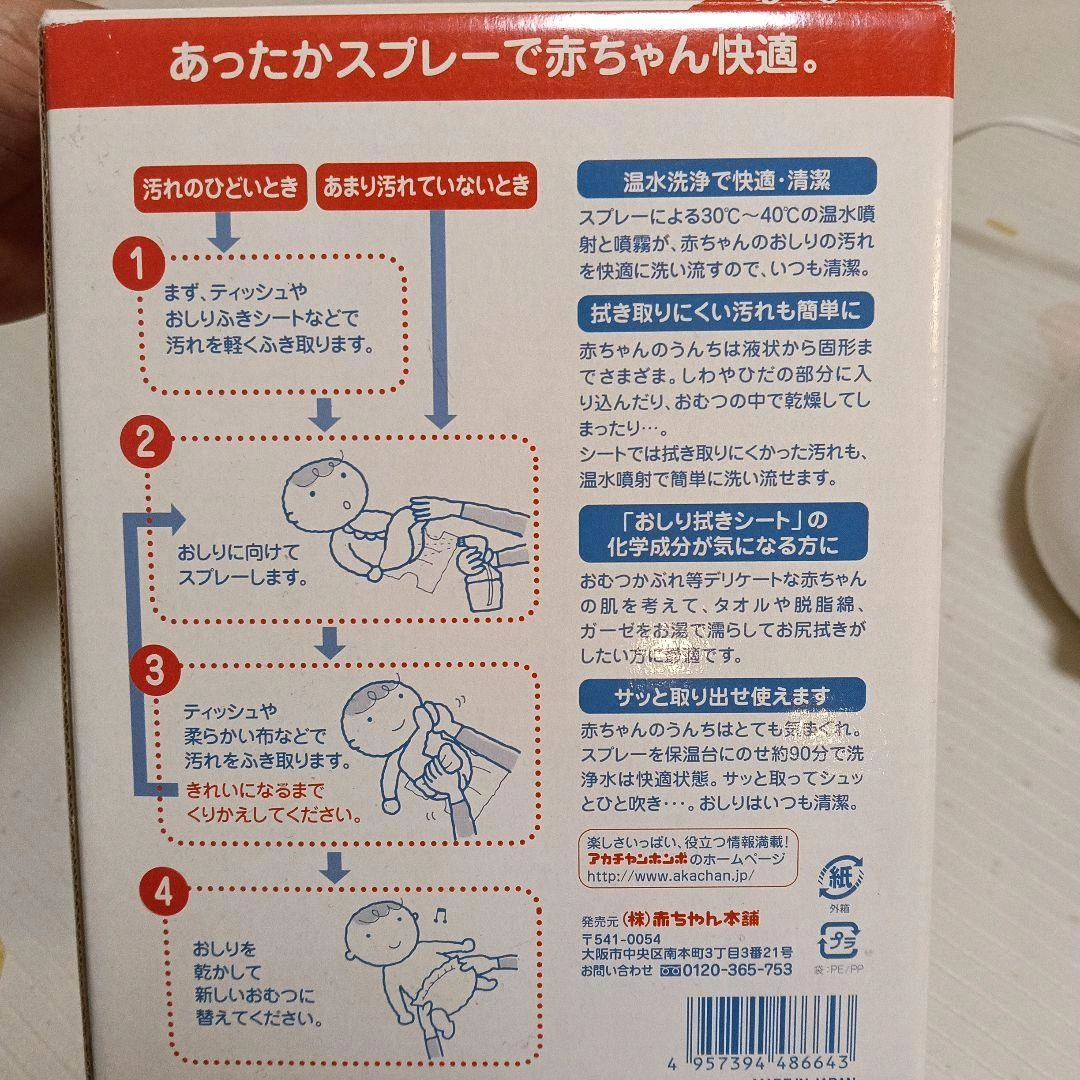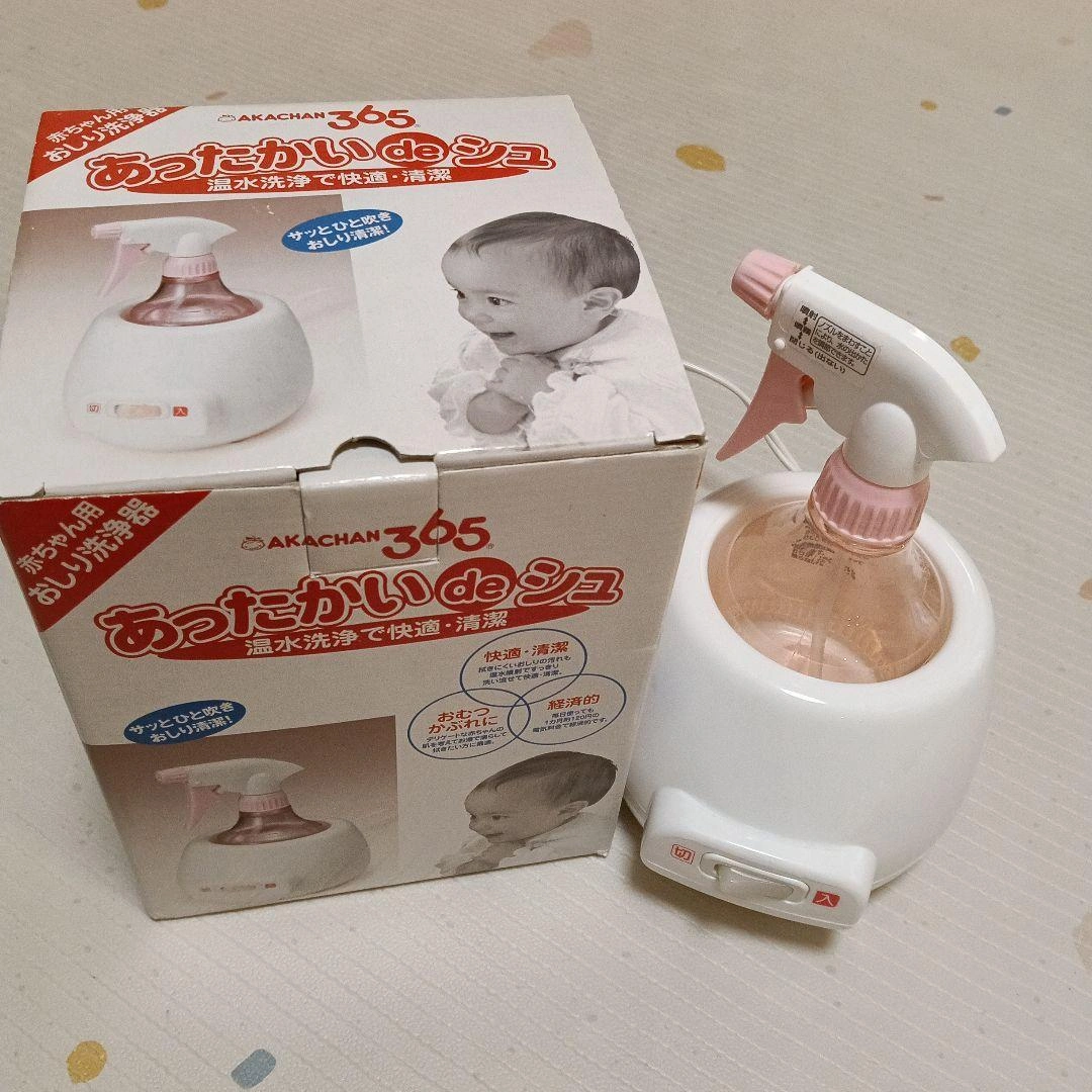 赤ちゃんのための温水スプレー式おしり洗浄器です。 暖かい時期に使用していたので本体は未使用です。動作確認済み。 ボトルには多少の擦れがあります。 赤ちゃんの柔らかいうんちを簡単に洗い流せるので便利でした。 - ブランド: AKACHAN 365 - モデル名: あったかい de シュ - 機能: 温水洗浄・清潔 - 使用方法: スプレー式で赤ちゃん快適 - 容器材質: 透明プラスチック - 色: ホワイト・ピンク ご覧いただきありがとうございます。
