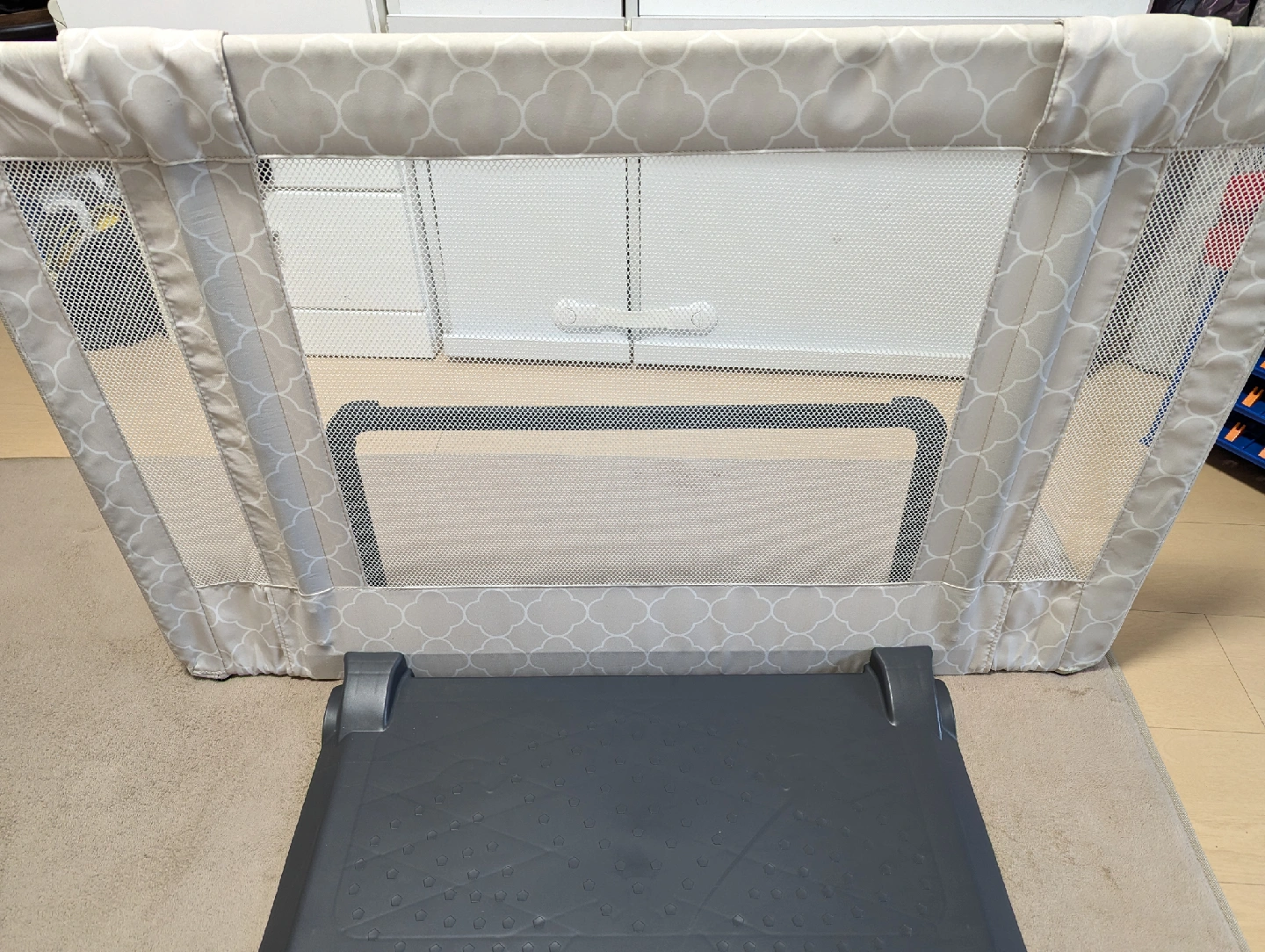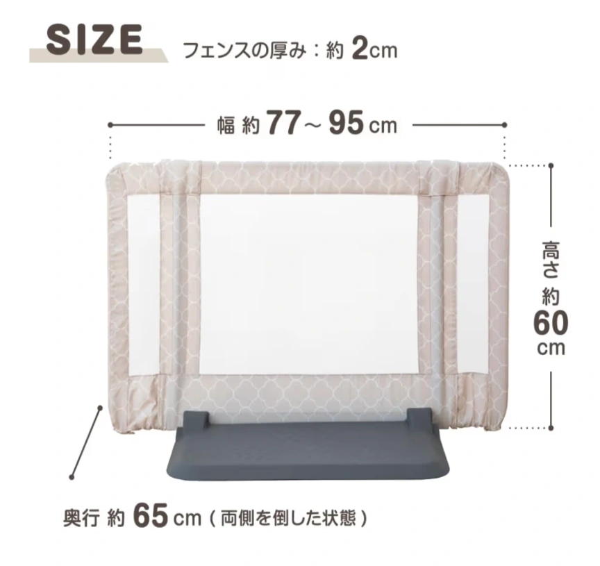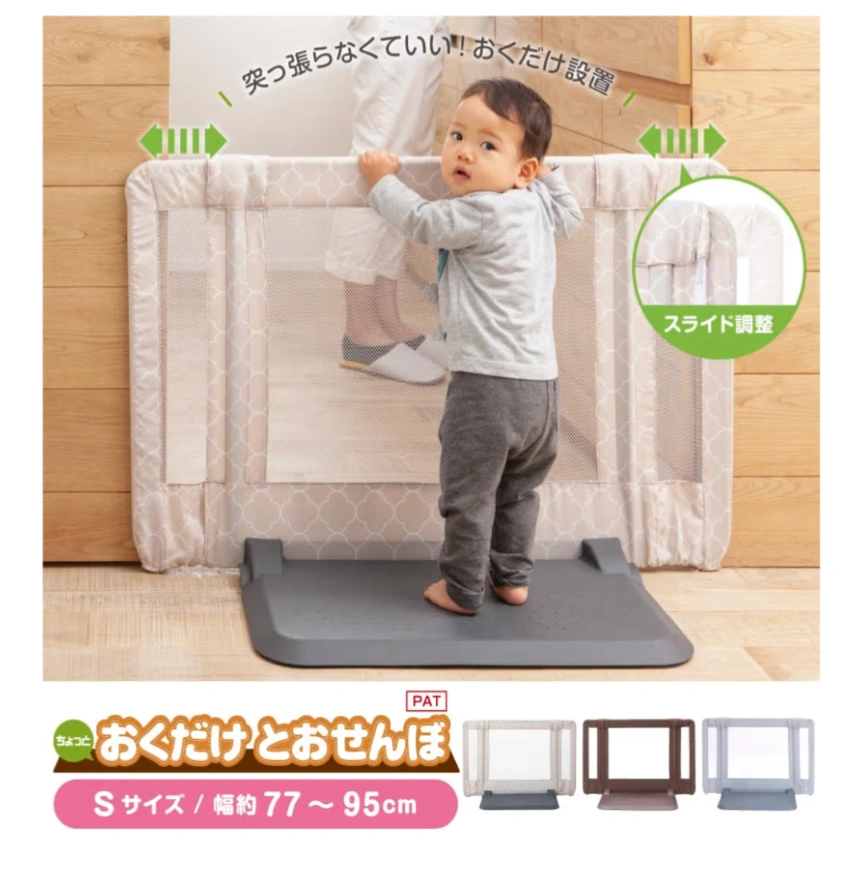 おくだけとおせんぼ 日本育児 説明書付き ・サイズ:Sサイズ(約77〜95cm) ・高さ:約60cm ・奥行き:約65cm(両サイドを倒した状態) ・フェンスの厚み:約2cm ・色:モロッカンベージュ ・多少の使用感あり 3年間使用したベビーゲートです👶🏻 念の為除菌済みでお渡しします。 中古品であることご了承ください。 他にもベビーゲート出品しています!