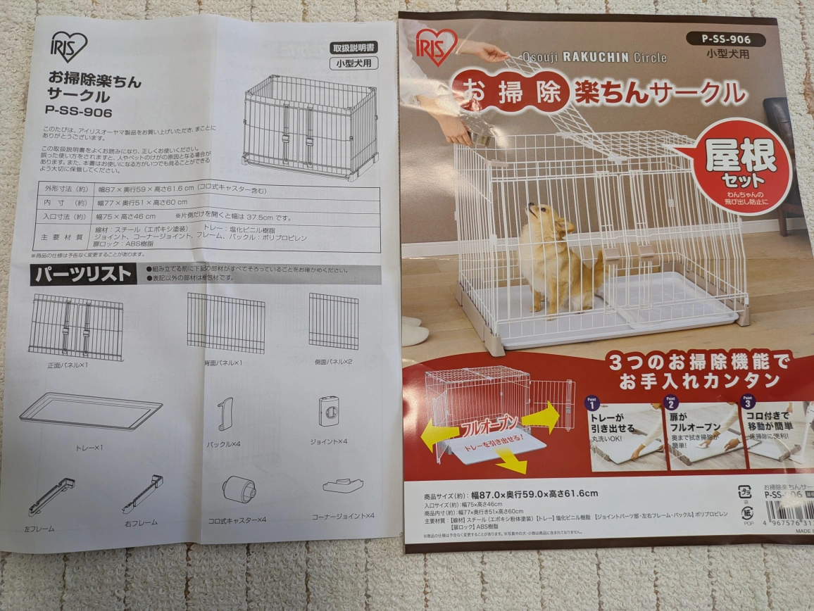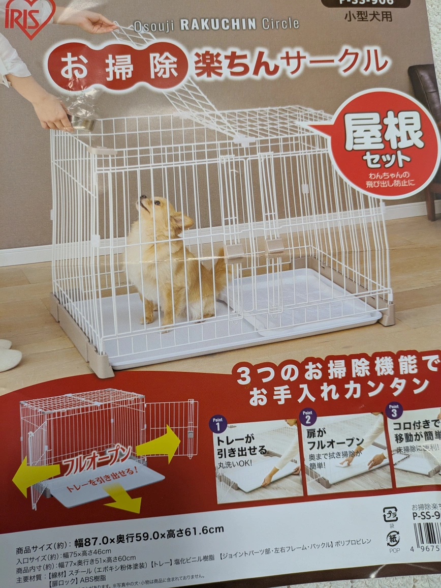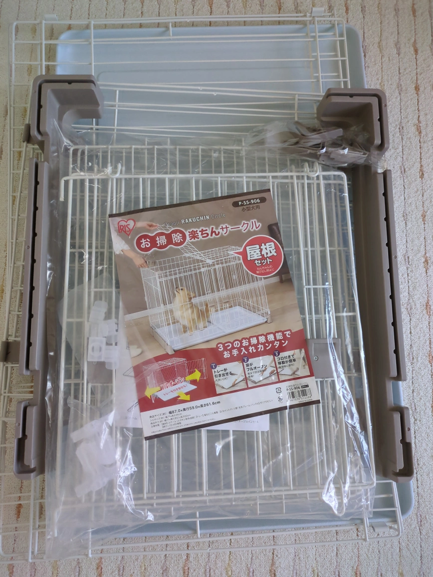 【情報】 ブランド:アイリスオーヤマ 型番:P-SS-906 種類:サークル 対象:小型犬用 サイズ:約 幅87.0×奥行59.0×高さ61.6cm(キャスター含む) 【状態】 〇立てなくなった小型犬の老犬を介護する際に使用していました。このサークルは、遊びに来る人間の小さな子どもからも老犬を守ってくれました(笑)。 できるだけ床擦れしないようトレーの上に毛布を敷きふかふかにした上にペットシーツを敷いて使用していたので、たいした汚れも無く、錆も無い状態です。 更に出品前に清掃と消毒をいたしました。 〇お箱はございませんが、組み立て方が記載された取説はございますので同封いたします。 〇出品に際し、パーツごとにバラして4枚目の画像のように まとめてありますので、使用時には取説を参照なさって組み立ててからご使用なさって下さい。 〇ウチでは使用してなかったのですが、半分開ける事ができる天井部があるので、ジャンプ力が高いペットちゃんがサークル外に飛び出す事はないと思います。 【受け渡しに関して】 〇計量したところ、【7Kg】でした。バラした画像4枚目の状態のサイズは約【88cm × 60cm × 11cm】でした。 〇バラしてまとめてあっても大荷物ですので、運搬に関してご無理のないように お気を付け下さい。 ◎2人で運べるよう、2つに分けて袋に入れておきます。 〇お車で取りに来られる場合は、できるだけ出品者自宅に近い場所にしていただけますと嬉しく存じます。 どうぞよろしくお願いいたします。
