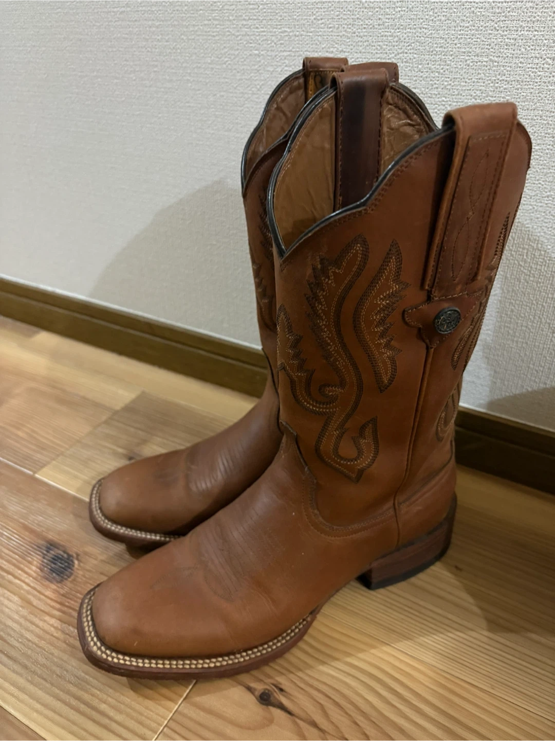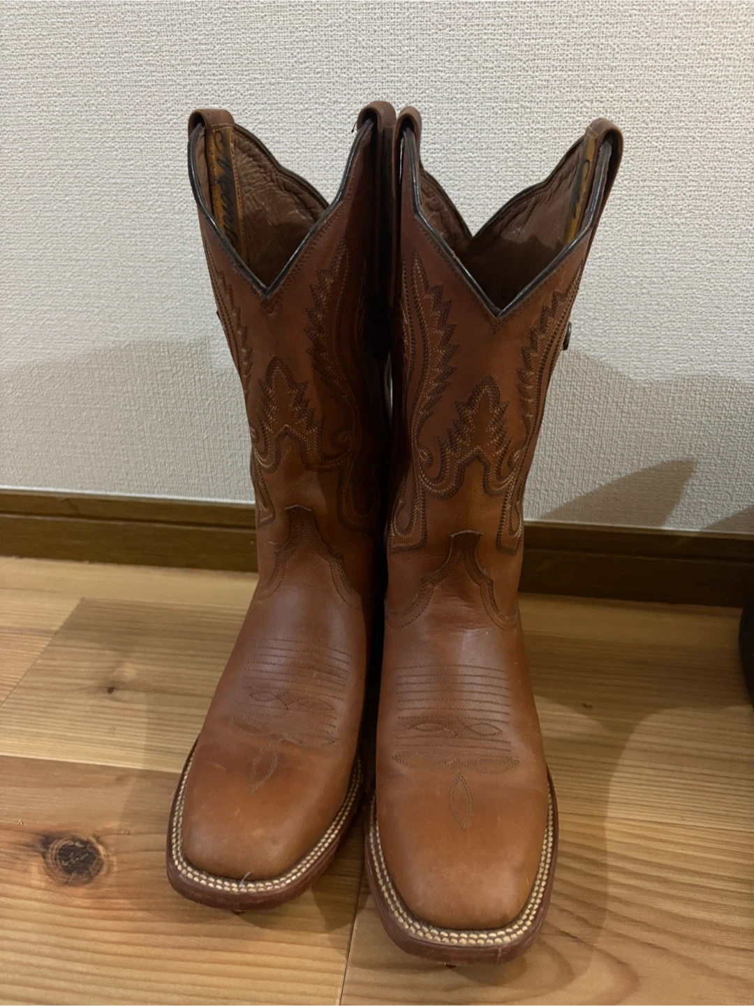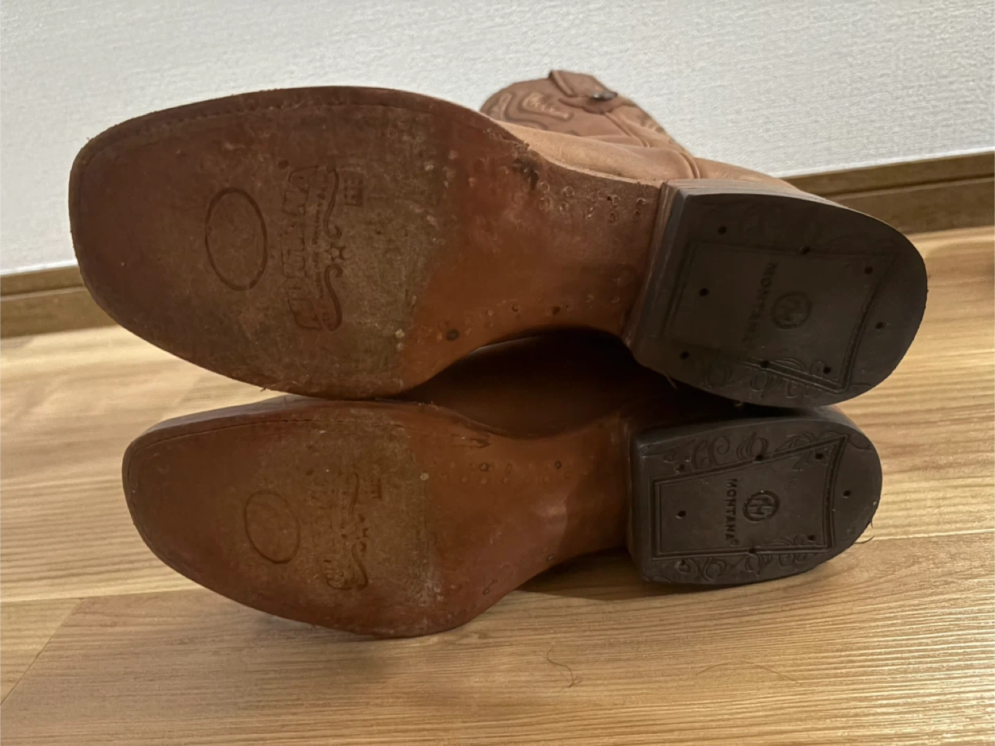 モンタナのウエスタンブーツです。リサイクルショップで購入しましたが、サイズが合わず出品します。 ※私が履いている普段のサイズは24〜24.5cmですが、足首のあたりと甲の部分(幅)がややきつめでしたので、23cmくらいのサイズの方が適しているのではないかと思います。 ・サイズ:US7(約24cm) ・色:茶色 ・全体的に使用感あり ⭐️中古品であることご了承ください。 ⭐️受け渡しは土日祝に限ります。