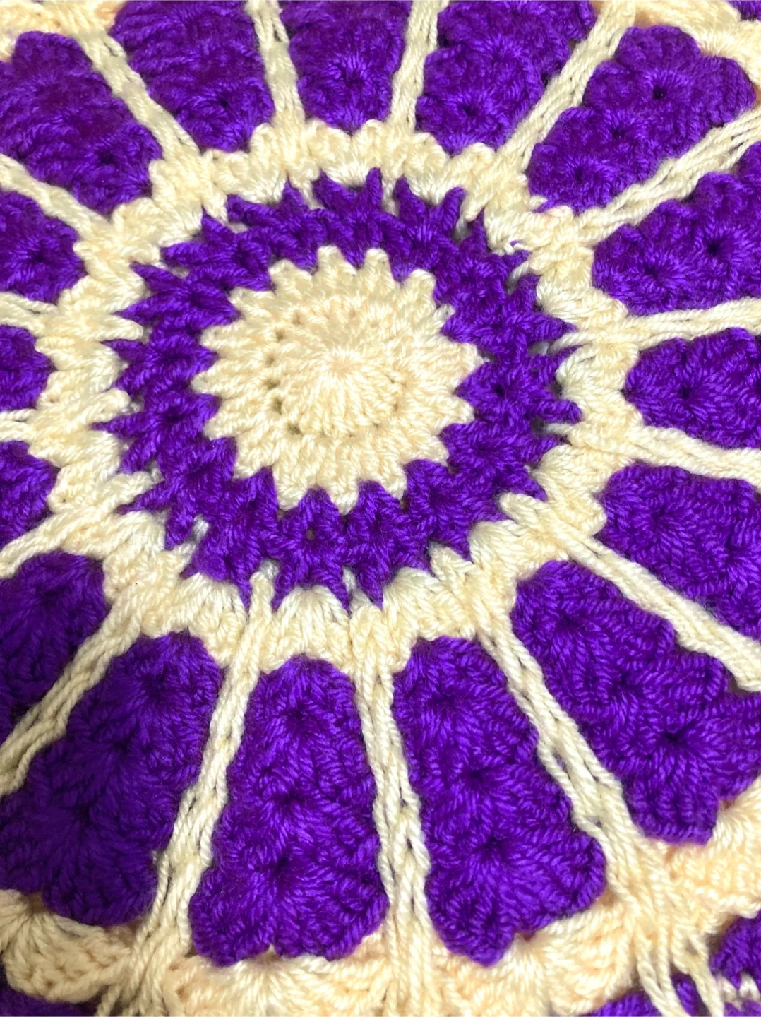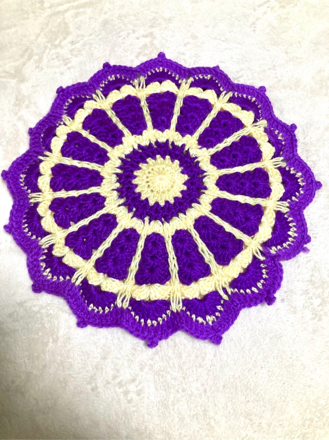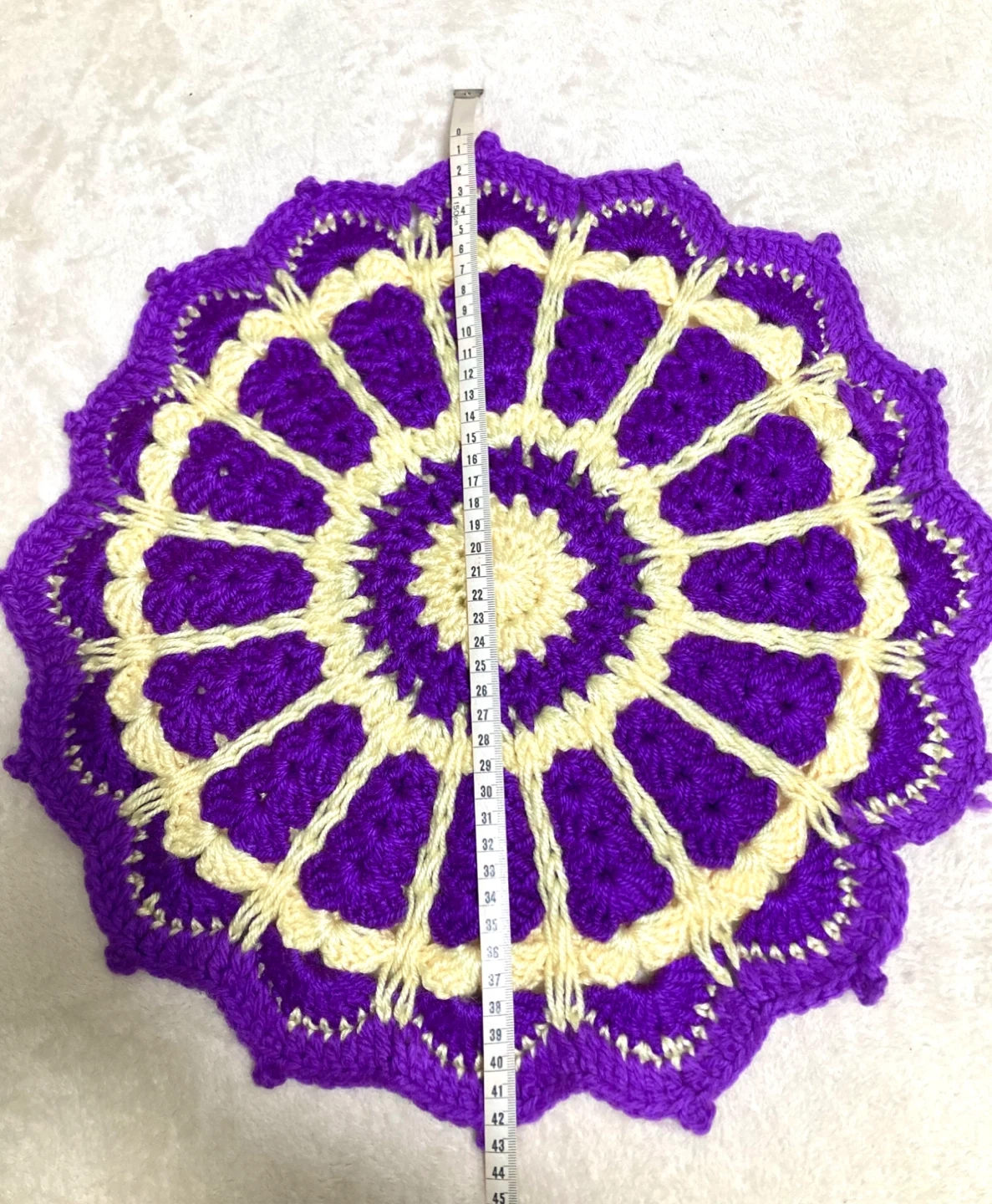 かぎ針編み 円形マット 紫とクリーム色  ハンドメイド:直径約43㎝:未使用:インテリア小物:ラグ:マット