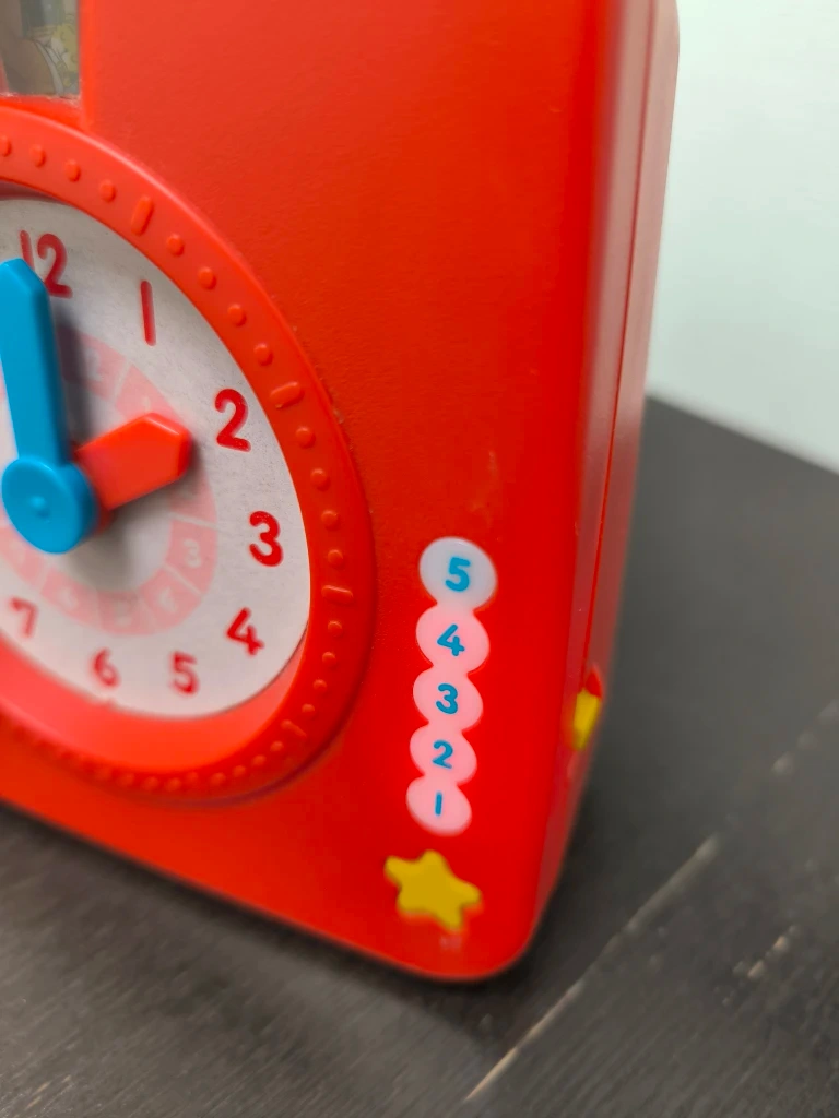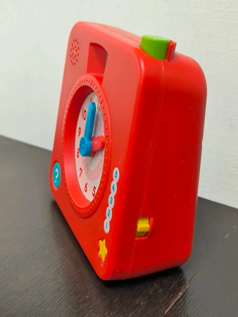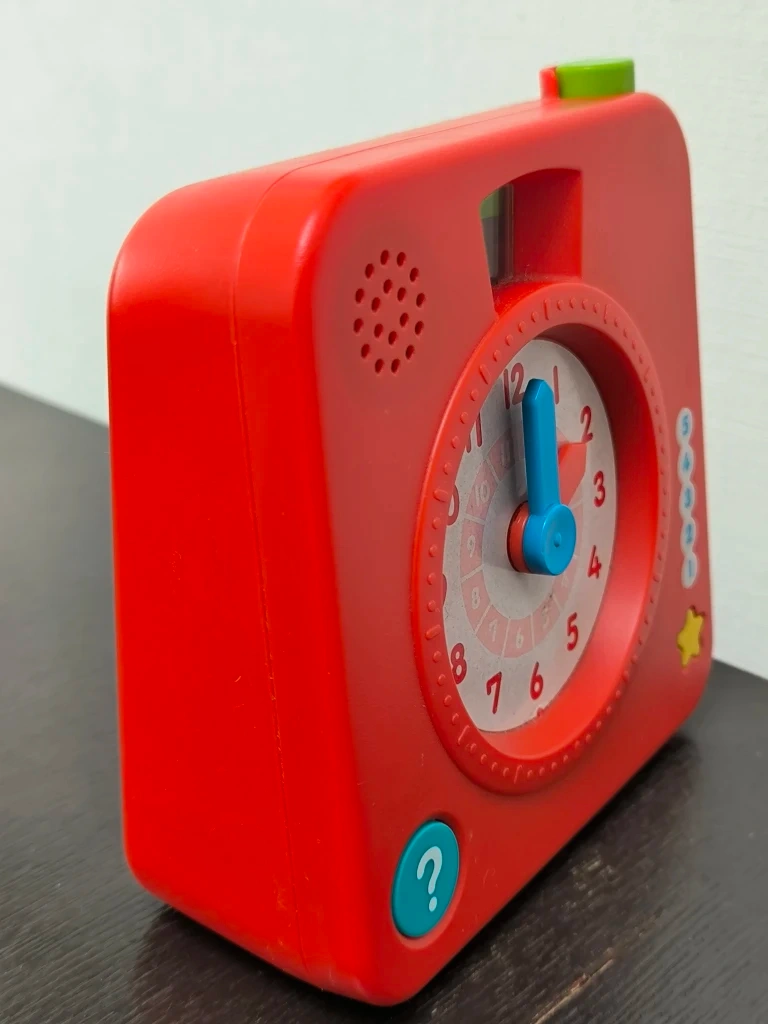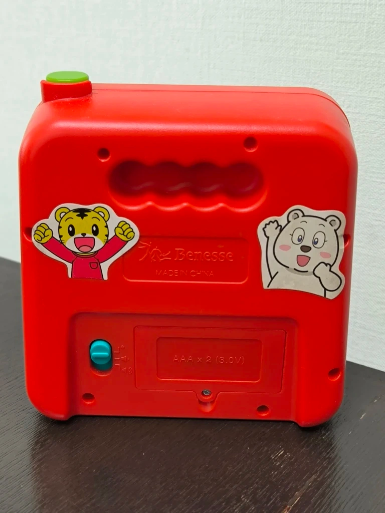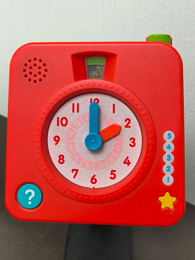 ベネッセこどもちゃれんじの教材、時計マスターです。 【オススメポイント】 ■時計が読めるようになる 「?」ボタンを押すと何時かに合わせるクイズが出て、その時間に針を手で合わせて、右手の緑ボタンを押すと正解音と音声が流れます。 ■てきぱきタイマー機能 右下の黄色星ボタンのてきぱきタイマーでは5分まで1分きざみでタイマーがセットできます。お片付けや、切り替えのためにタイマーセットすることで子供が動きやすくなりました。 サイズ 高さ約13.5mm 幅約13mm 奥行き約5.5mm 裏にシール貼ってあります。 あくまでも中古品になりますので、写真で状態をよくご確認いただき、使用感や少しのダメージも受け入れられないかたはご購入をご遠慮ください。 知育玩具 おもちゃ時計 入園前