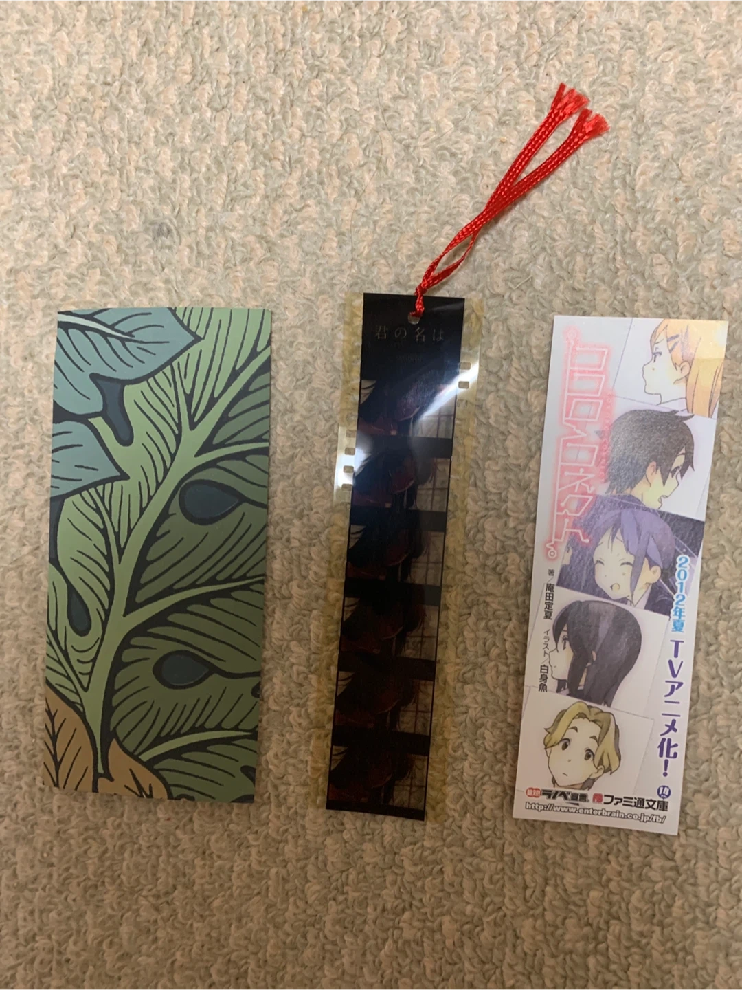 しおり3点セットです。 真ん中のしおりは、アニメ 君の名はのです ・デザイン、状態は画像をご確認ください。 中古品であることご了承ください。