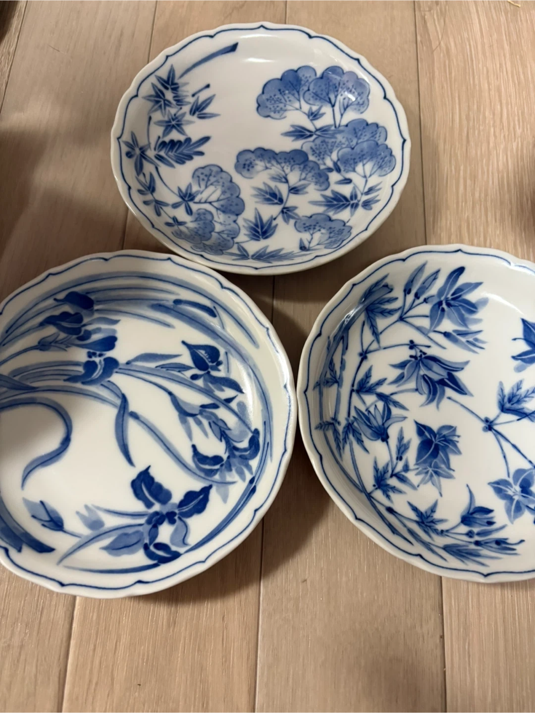たち吉の小皿 3種類あり全て柄が違います。直径15センチくらいと使いやすい大きさです。1枚の値段です。どちらがご希望かコメントください。 ・柄:花柄 ・色:白、青 ・状態:中古品、多少の使用感あり 中古品であることをご了承ください。 年内で処分します。