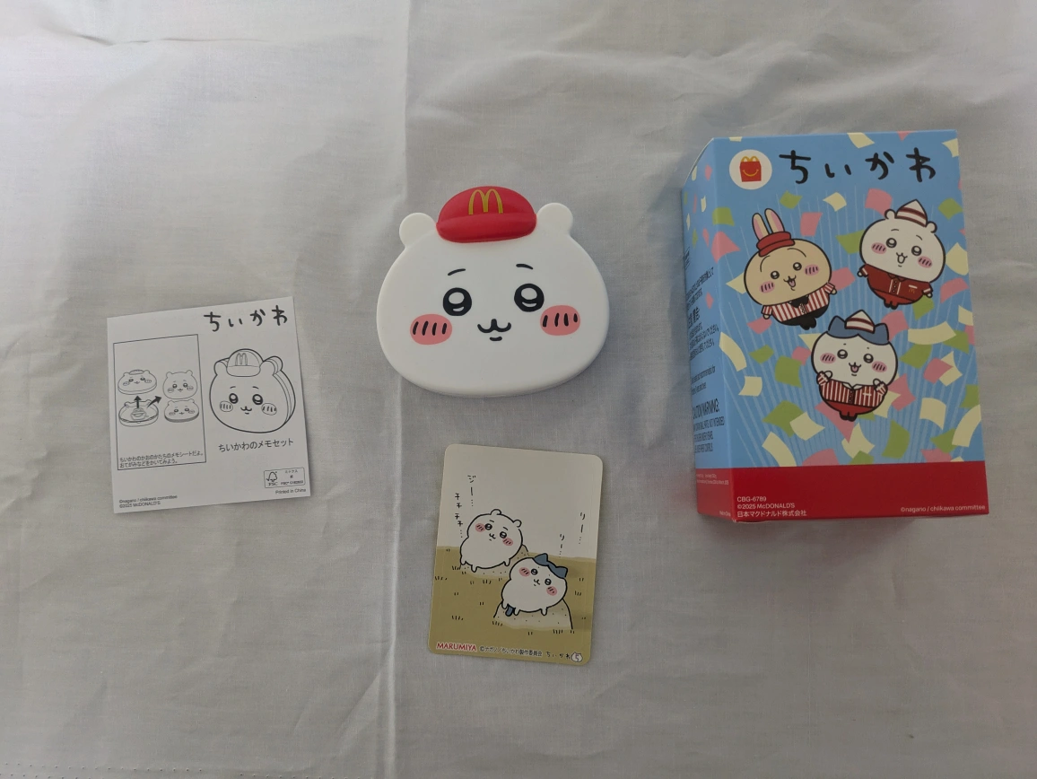 ちいかわハッピーセットです。 新品ではありません。 しばらく家で飾って箱にしまいましたが箱が合っているかわかりません。 シール1枚付けました。 写真をご覧下さい。 よろしくお願いします。