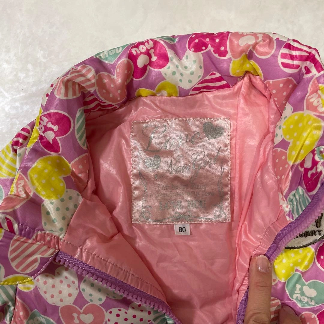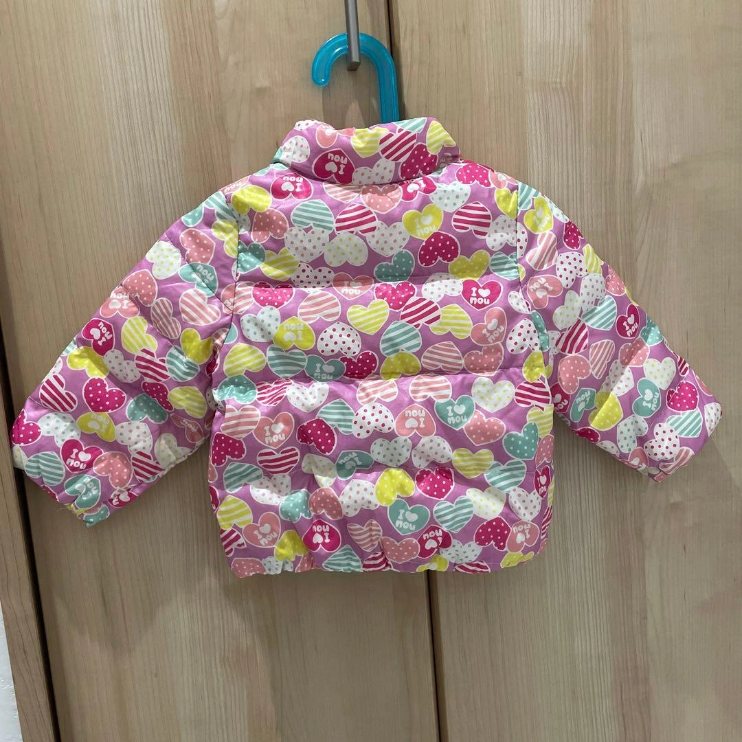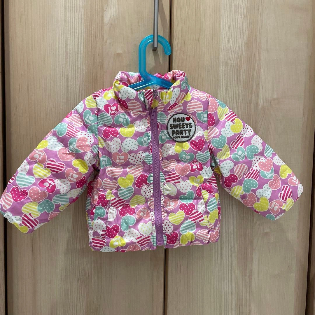 カラ フルなハート柄のジップアップアウター、サイズ80です。 - 色: ピンク系のハート柄 - サイズ: 80 - デザイン: ジップアップ、スタンドカラー - 特徴: カラフルなハート模様 - 素材: ダウン90%、フェザー10% お気に入りでよく着ました★ タグに名前を縫い付けていたので外して送ります。 もっこもこのダウンではないですがダウンなので暖かく、軽く重宝しました(*´꒳`*) ※目立つ汚れはありませんがあくまでも子供の使用した中古品になりますので見落としがあるかもしれませんし、完璧ではありません。ご理解いただける方によろしくお願いします。 気になる箇所があれば事前にお知らせくださいね★ 80のお洋服たくさんあります!
