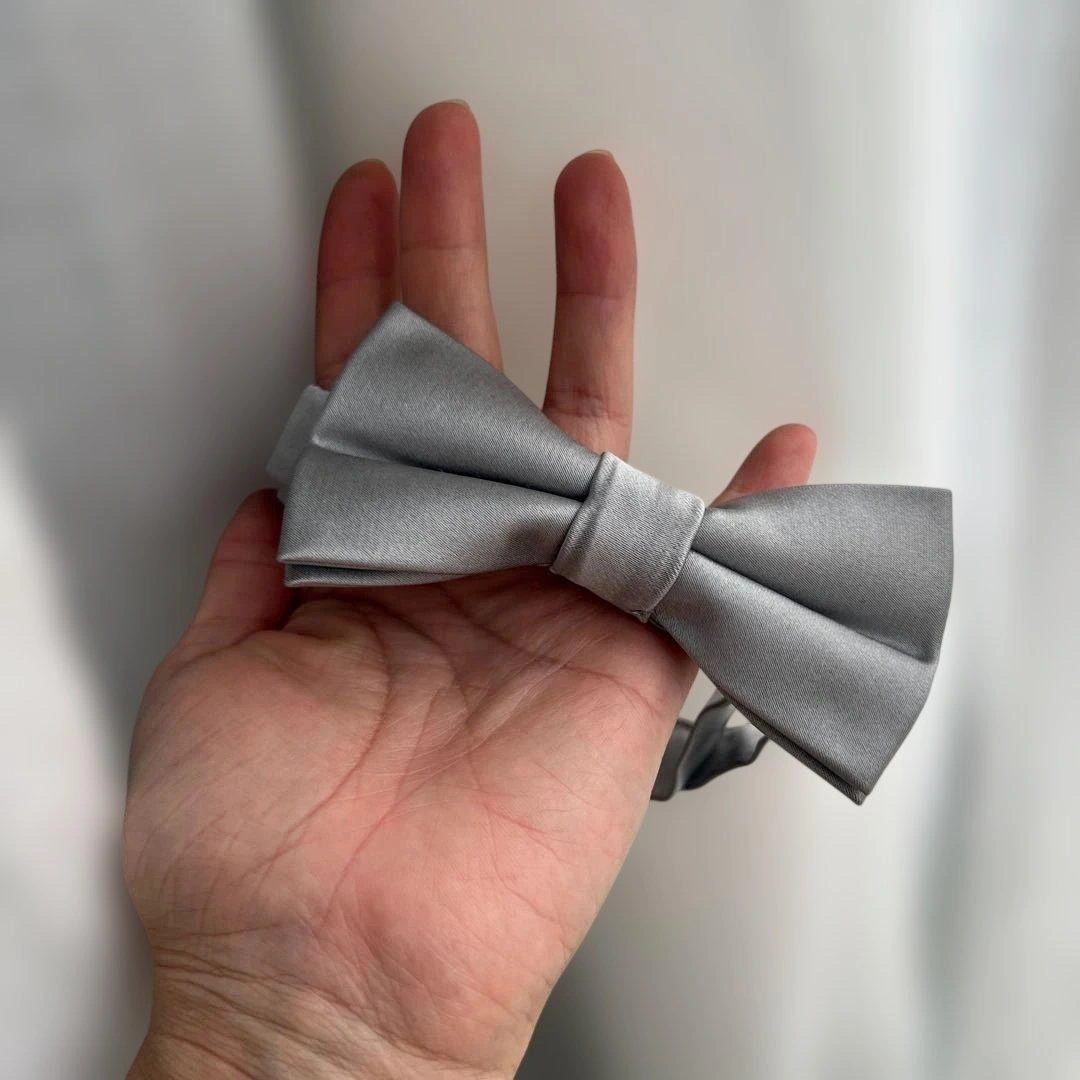 シルバーのプレーンな蝶ネクタイです。アジャスター付きで調整可能です。 結婚式で1度着用しました。 スーツのお店で購入しました。 - カラー: シルバー - デザイン: プレーンな蝶ネクタイ - 留め具: アジャスター付き ご覧いただきありがとうございます。
