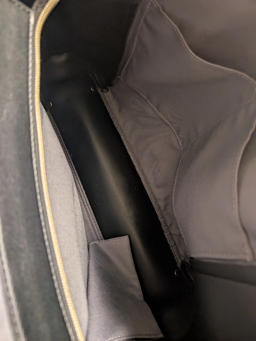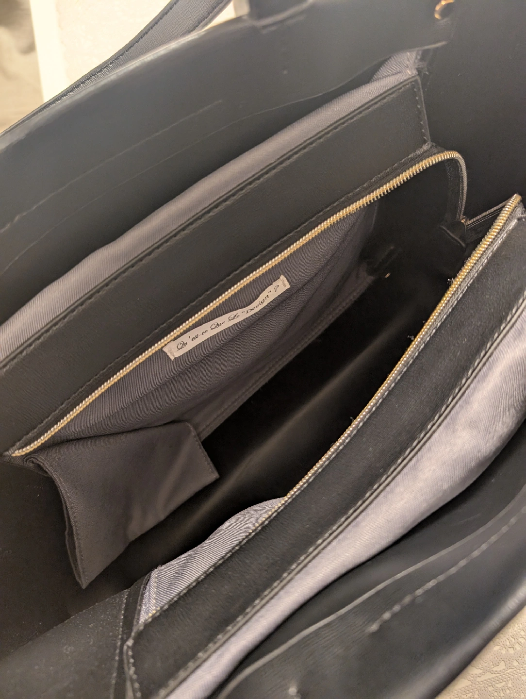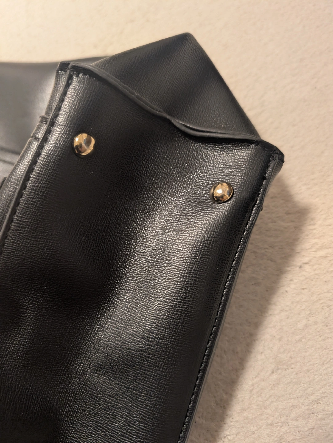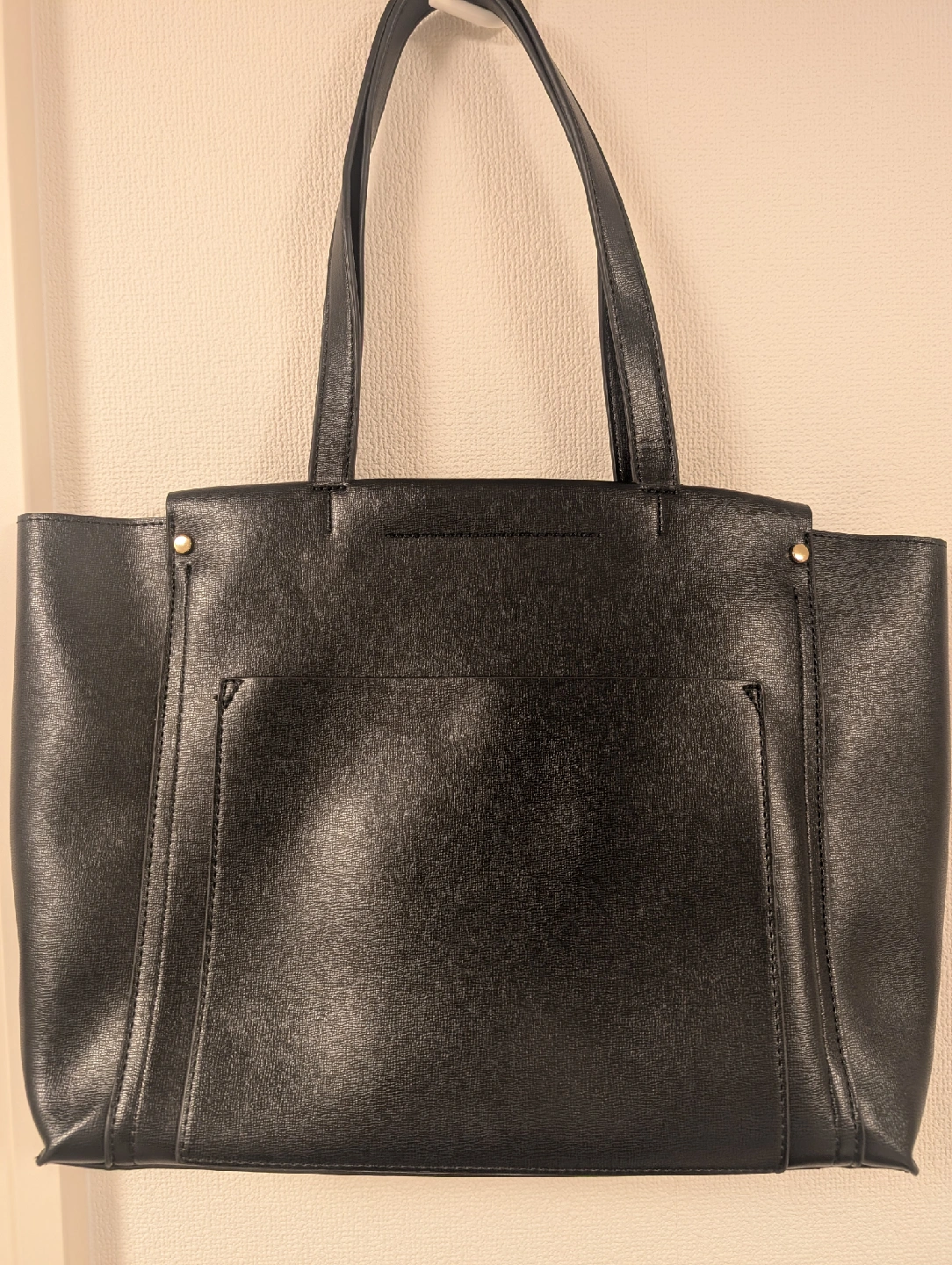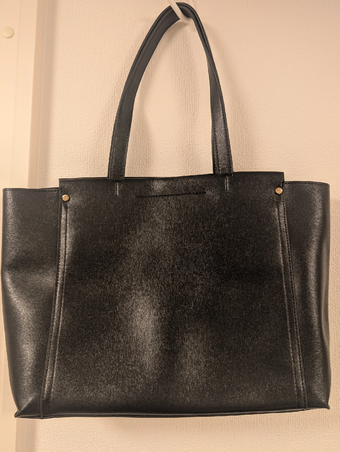 黒のトートバッグです、ほぼ未使用で保管時のシワが多少ありますが超美品 表参道のショップで5000円ほどで購入 ・カラー:ブラック ・素材:レザー調 ・内側にポケットあり ・使用感少なめ 中古品であることご了承ください