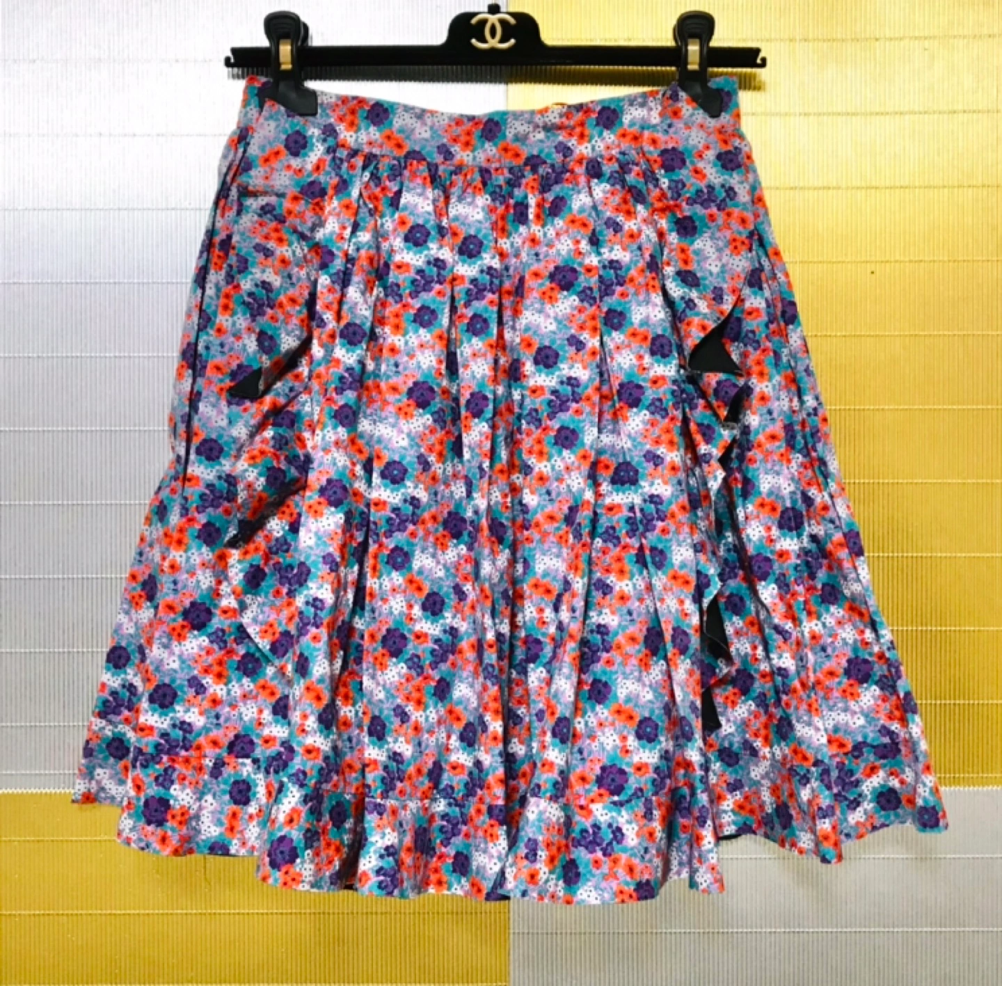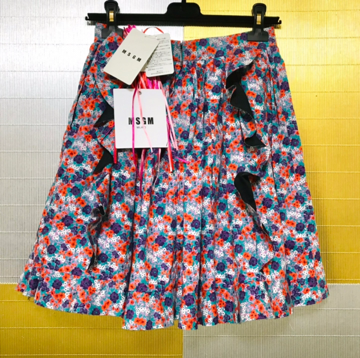 MSGMのスカート新品自宅保管です。 写真にて詳細等はご判断お願いいたします。 特に気になるようなダメージ類は見当たらないようです。 フロントとバックに縦フリルが左右にあり、ガーリーです。 細かいフラワーモチーフデザインで、可愛さいっぱいのスカートだと思います。 サイズはイタリア42です。 コットン100%ですので、ほとんど伸縮性はありません。 平置きウエスト   33cm スカート丈     50cm(中央) スカート裾幅    60cm 後ろファスナーレンジ  19cm