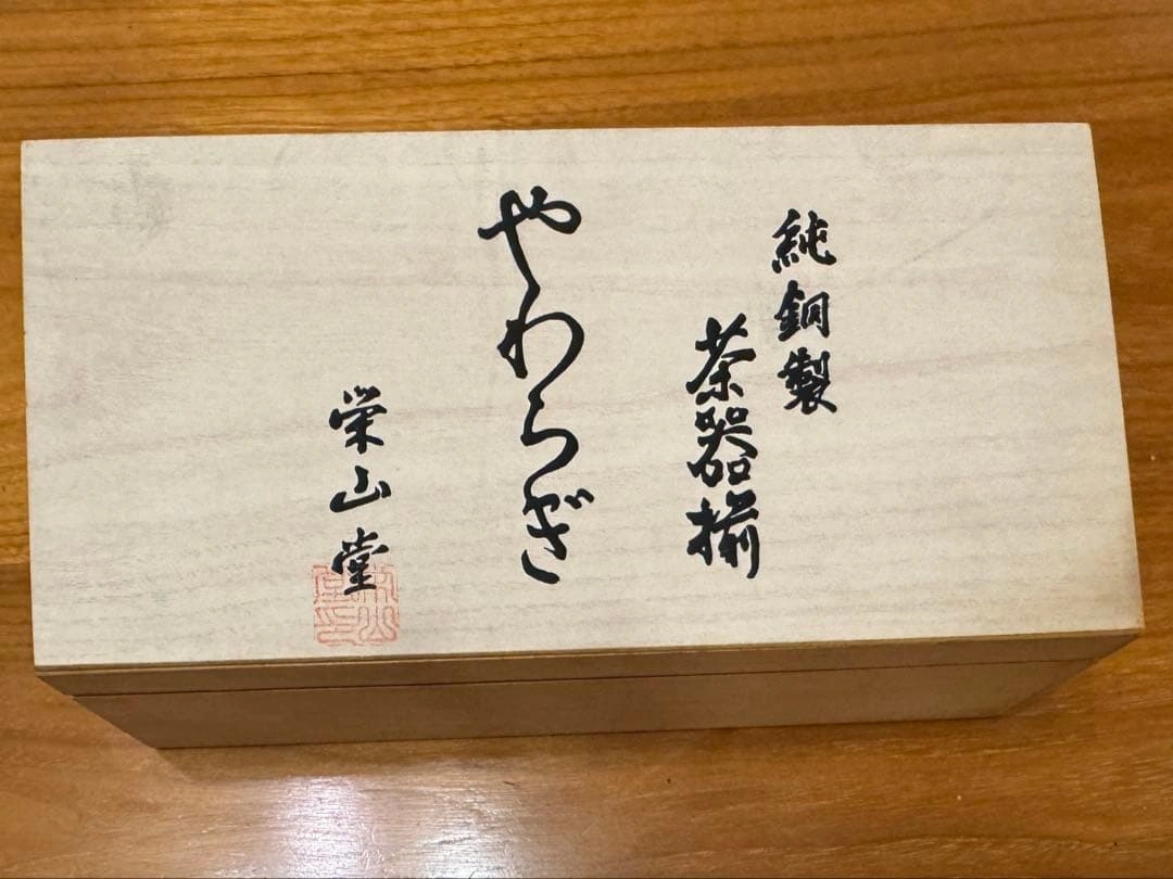 銅製の茶器セット、やわらぎ、栄山堂製です。 - ブランド: やわらぎ - 素材: 銅製 - セット内容: 茶匙、茶こぼし、茶托、茶筒 - 製造元: 栄山堂 ご覧いただきありがとうございます。 新品未使用で保管していましたが、木箱に多少の汚れ、茶筒の中に、キズのようなものがあります。 Amazonでは、14,999円で販売されているようです。 ご希望の方はお気軽にご連絡ください。 日時によっては、ファミリーマート以外でもお渡し可能です。