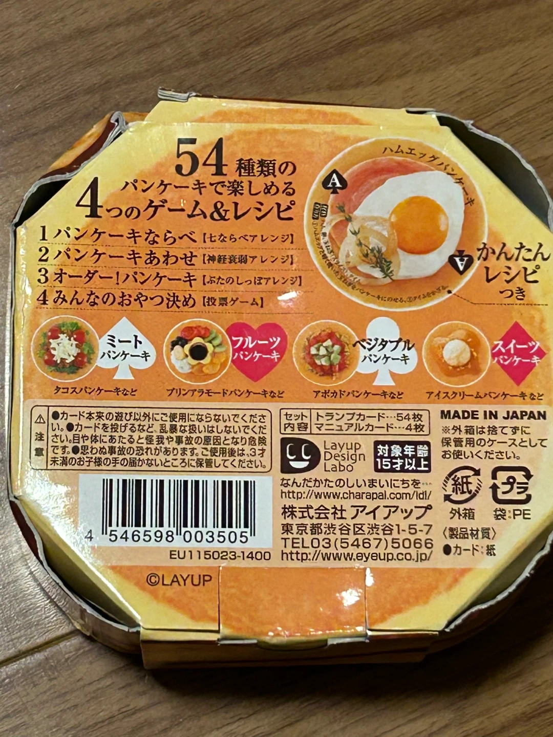 アイアップのPANCAKE CARD カードゲームです。 ・ブランド:アイアップ ・商品名:PANCAKE CARD ・付属品:マニュアルカード4枚 ・対象年齢:15歳以上 ・MADE IN JAPAN 未使用ですが箱は少々傷あり 中古品であることをご了承ください。