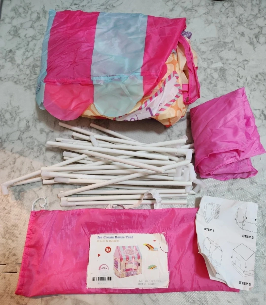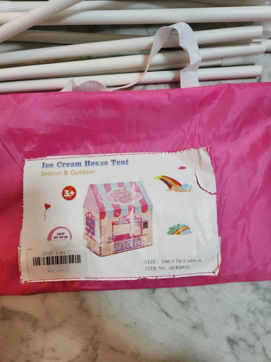 子供用アイスクリームハウステントです。 3回ほど使用しましたが、子どもがハマらなかった為、出品します。 骨組みに1か所折れがあり、テープで補強しています。 ・ピンクを基調としたデザイン ・組み立て式 ・説明書付き 中古品であることをご了承ください。