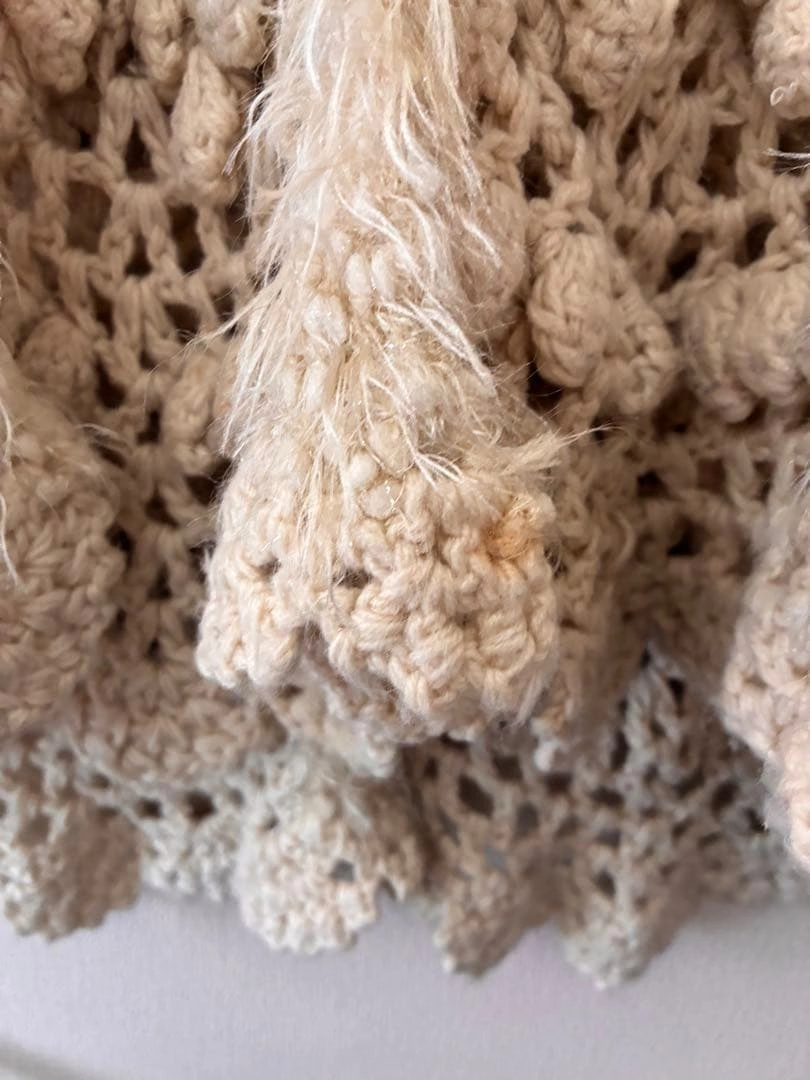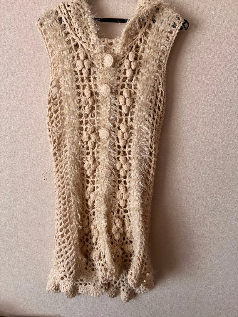 フード付きのアイボリー色ニットベストです。レイヤードスタイルに最適なデザインです。 こちらを重ねて着るだけで、ほっこりスタイルになるかと思います。 所々シミがあります。写真をご確認ください。 - 色: アイボリー - デザイン: フード付き、ボタン付き - 素材: ニット - スタイル: レイヤードスタイルに最適 ご覧いただきありがとうございます。 受け渡し場所は、綱島駅、新綱島駅でも 可能です。