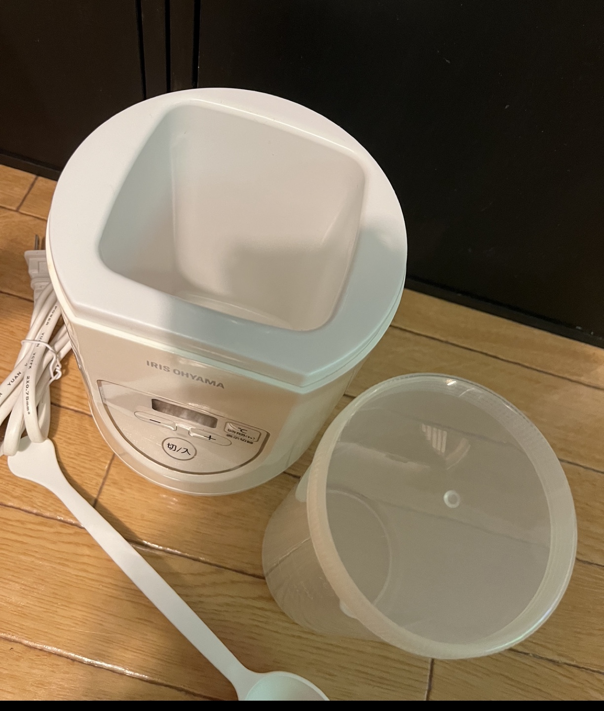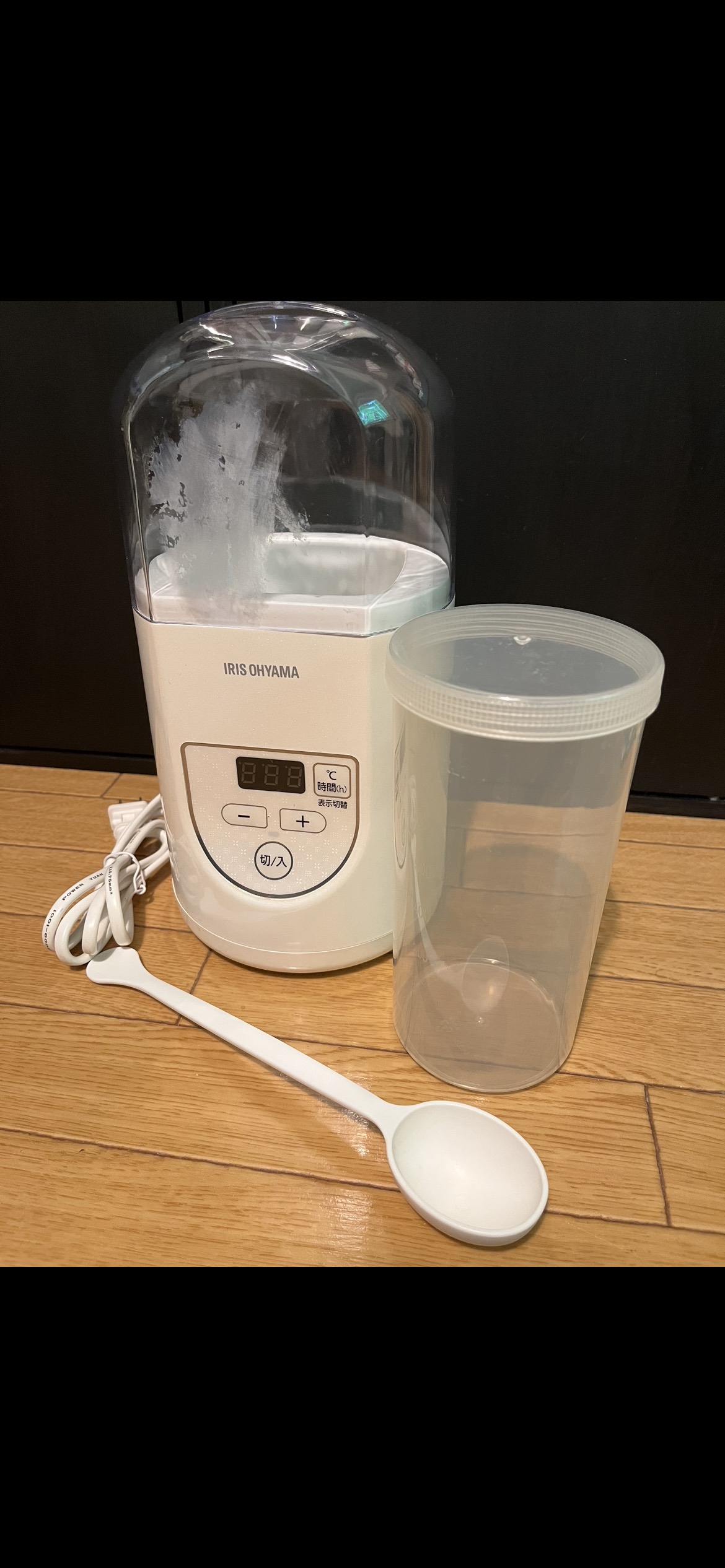 蓋部分の曇りは、購入時シールが貼ってありベタついていたのでアルコールで拭き取ったところ曇ってしまいました。外側なので中には影響はありません。 ヨーグルトや甘酒など様々なものがつくれます。付属のスプーン、中の容器はあります。 駅前でのお取引も可能です。(女性限定)